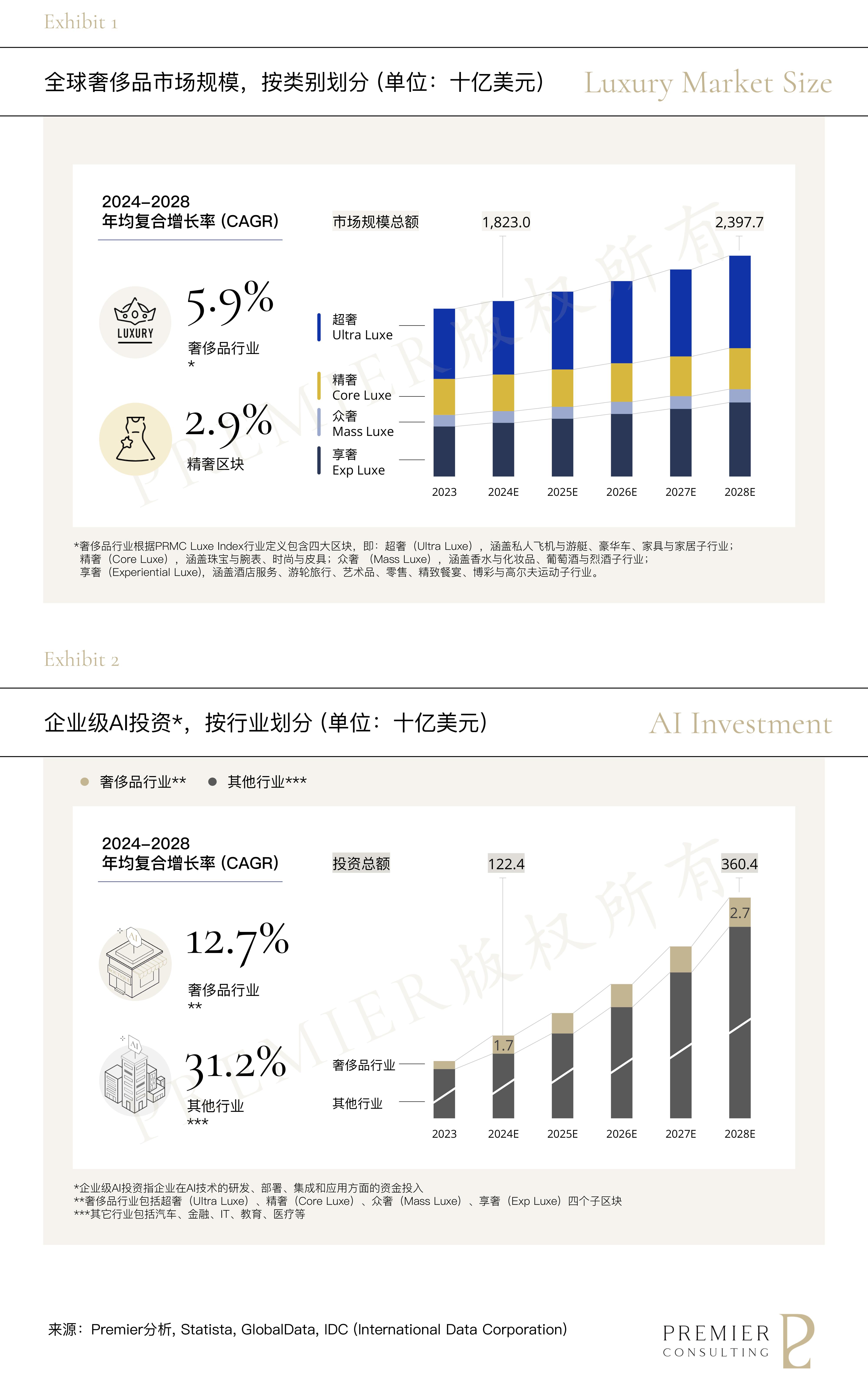 然而,整体行业对AI的投入增速依旧可观。GlobalData研究显示,奢侈品行业在过去三年对AI的累计投资逾3.6亿美元,较前三年期同比增长79%。Premier预计,2024至2028年间,全球奢侈品公司的AI相关投入CAGR将维持在约12.7%;至2028年,奢侈品行业企业级AI投入将达27亿美元[Exhibit 2],相当于同期全球奢侈品市场规模的1‰。
