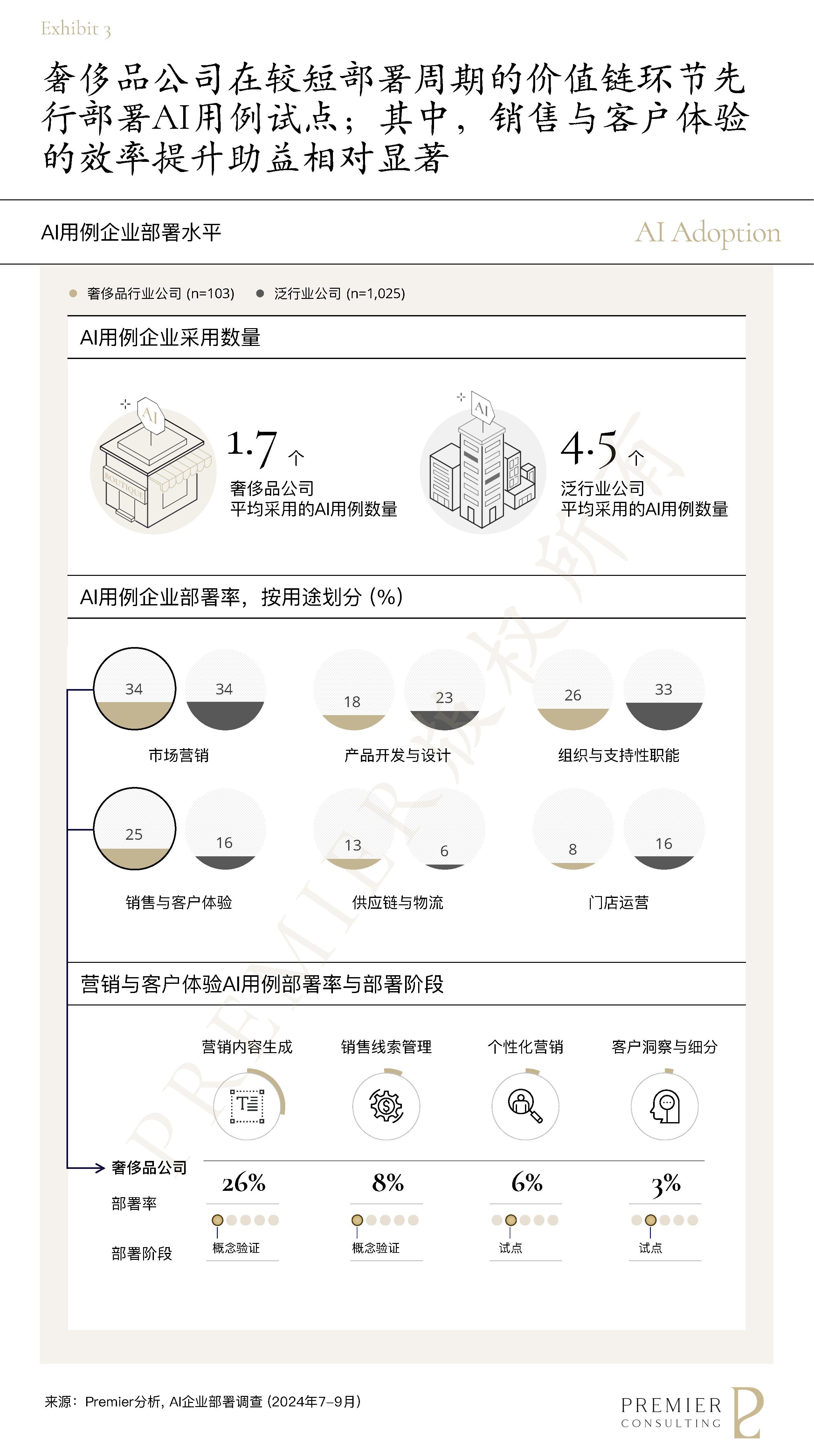 符合预期的是,相较其他行业,奢侈品公司的自身AI采用更谨小慎微。根据今年AI企业部署研究结果显示[Exhibit 3],奢侈品公司的平均AI用例 (AI Use Case) 采用数量仅为1.7个,低于其他行业公司均数近3个用例;而近1/3的奢侈品公司尚未对AI进行商用布点。