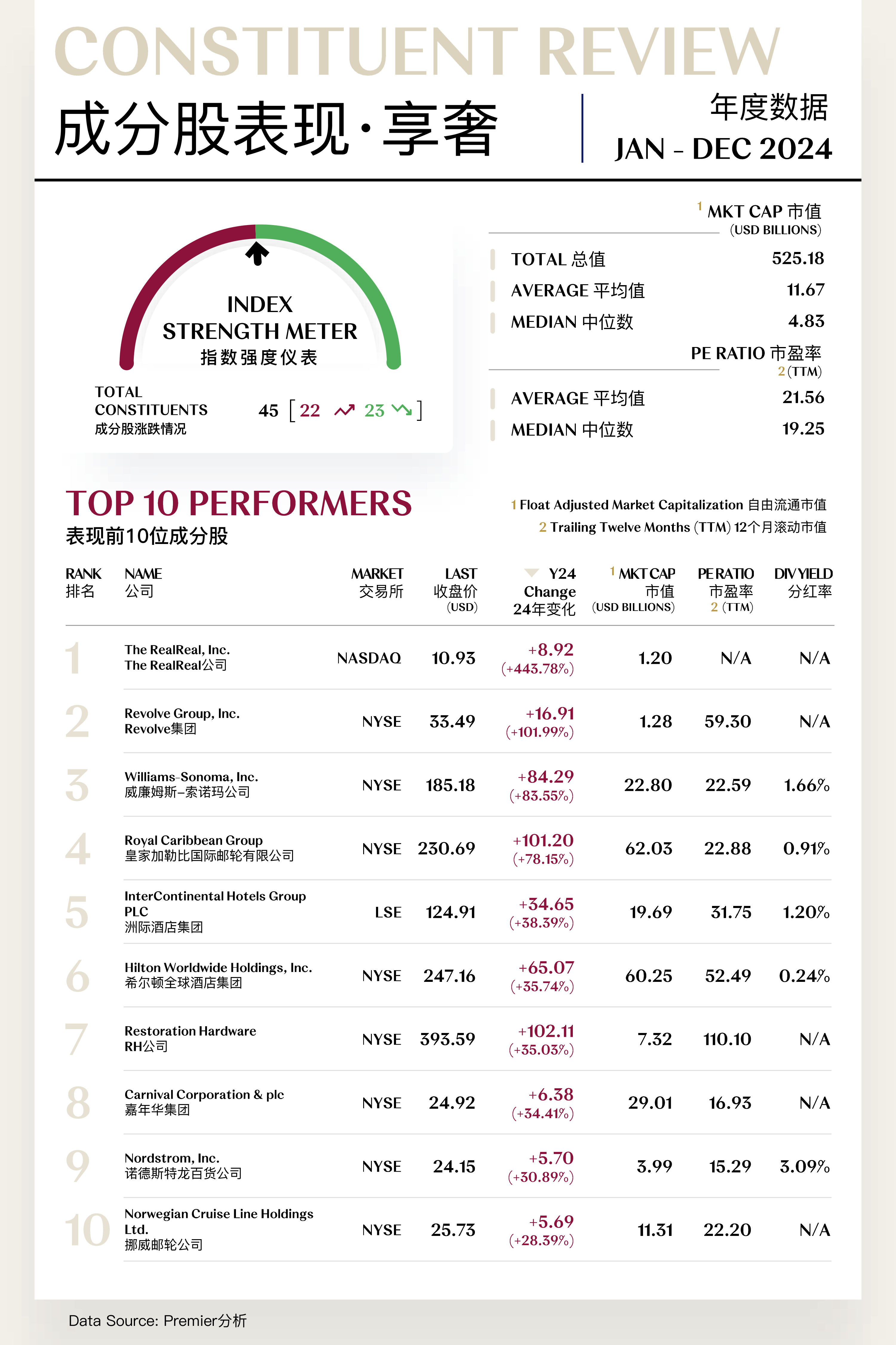 享奢指数(Experiential Luxe Index)共包括45支个股,其中22支上涨,23支下跌。