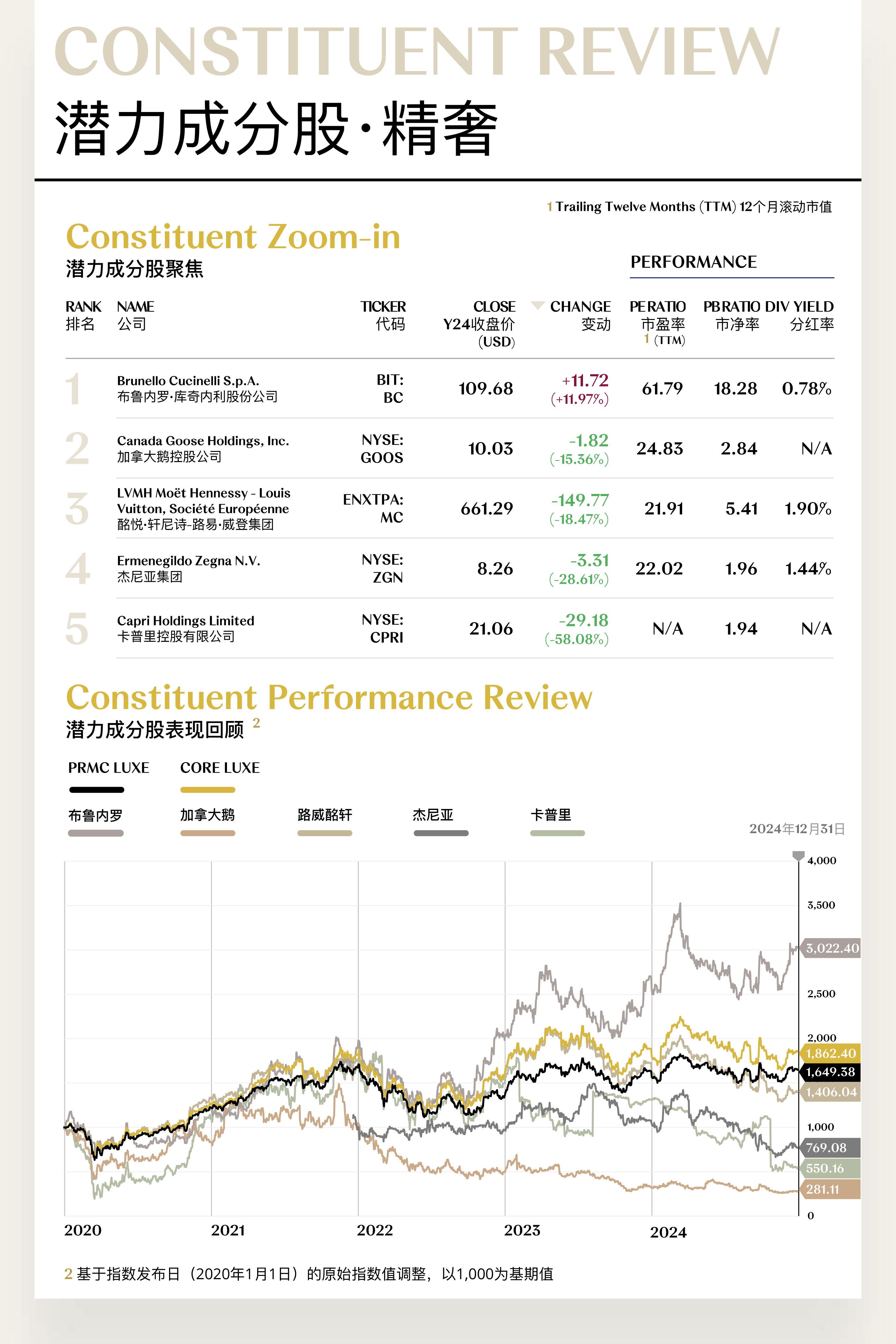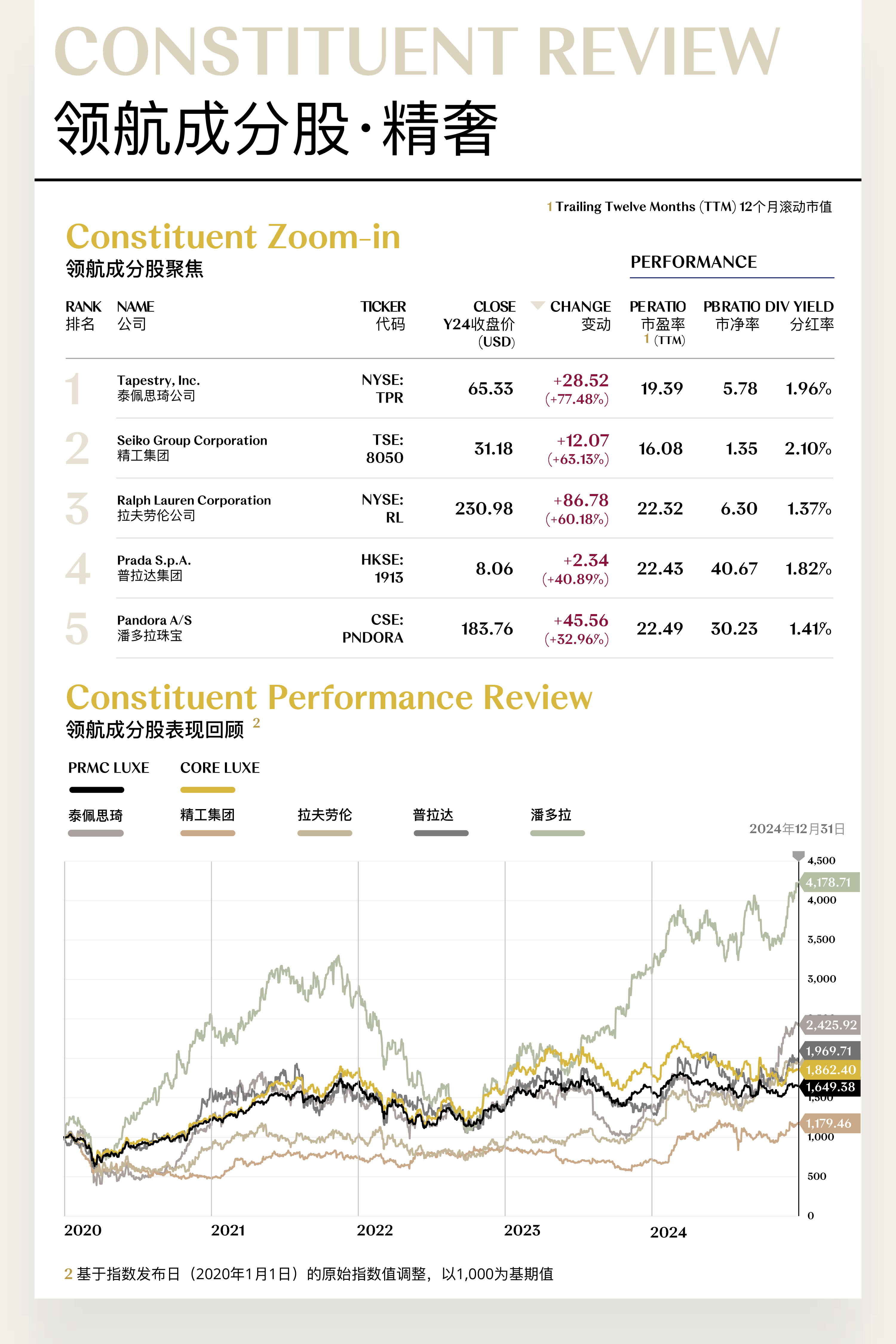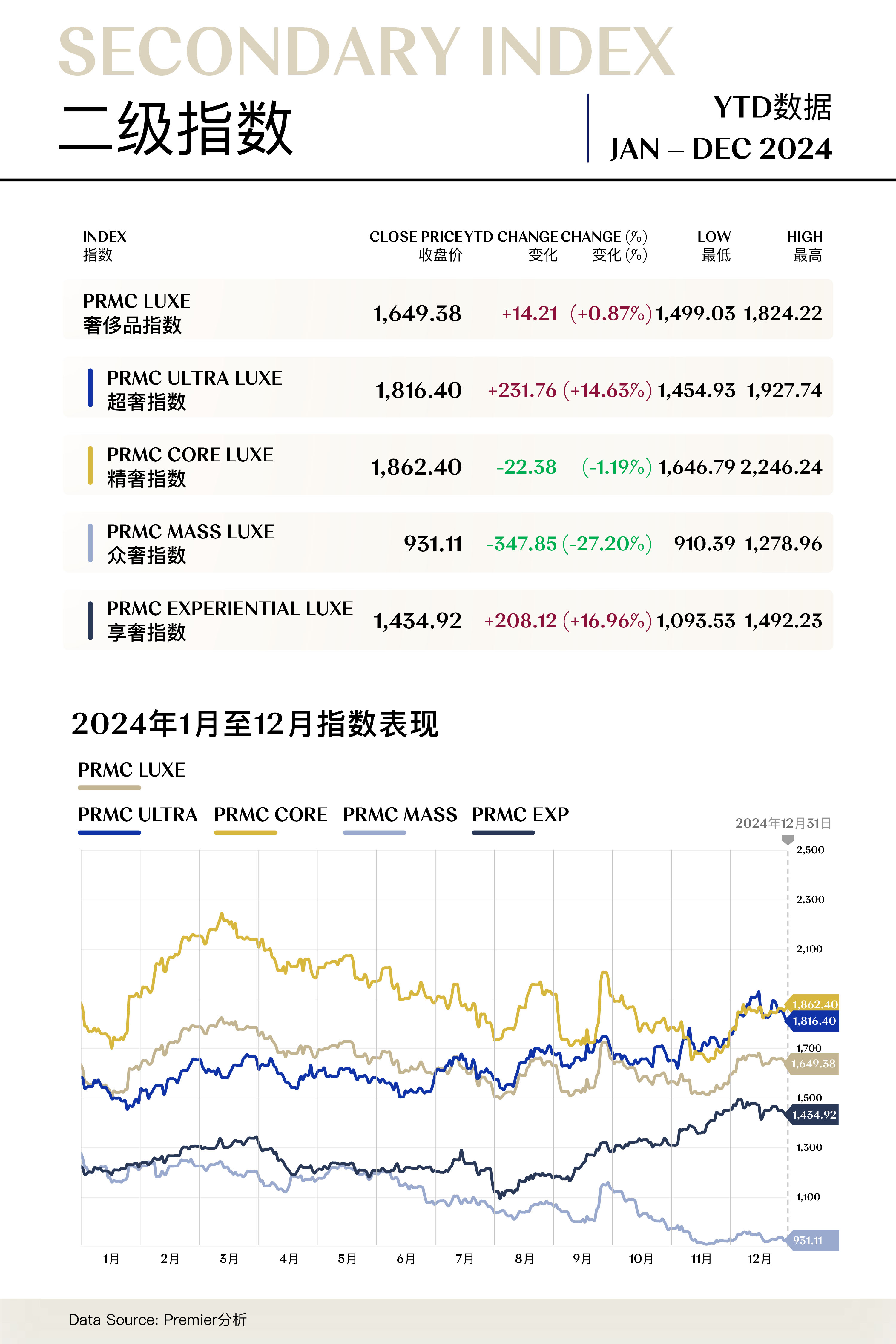 Premier通过聚焦溥元奢侈品指数(PRMC Luxe Index)中4支二级指数重点成分股表现(即超奢Ultra Luxe、精奢Core Luxe、众奢Mass Luxe、享奢Experiential Luxe),辅以指数动向分析,以数据为矢,为投资者划开市场迷雾,在波动性叙事中捕捉确定性跃迁路径。