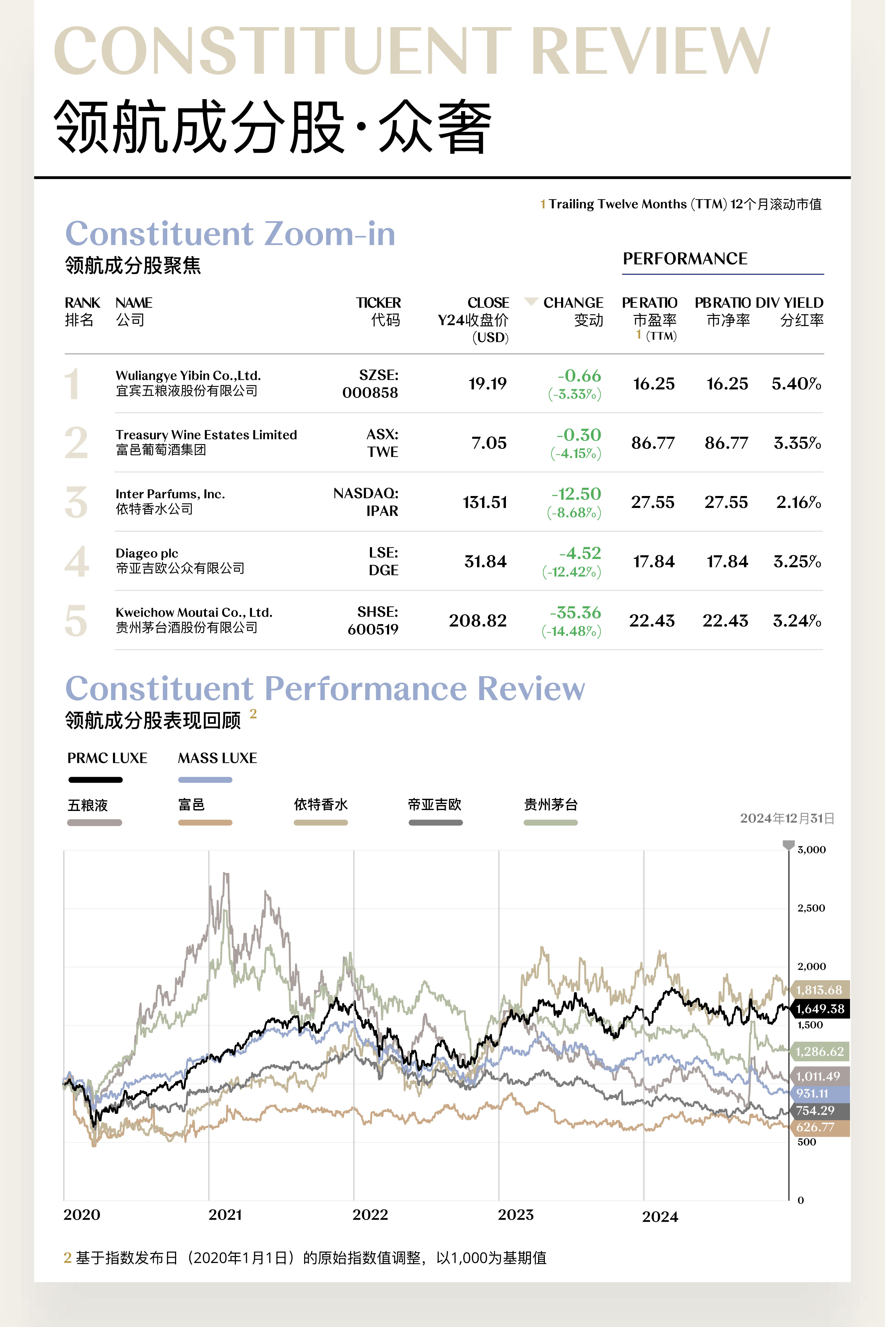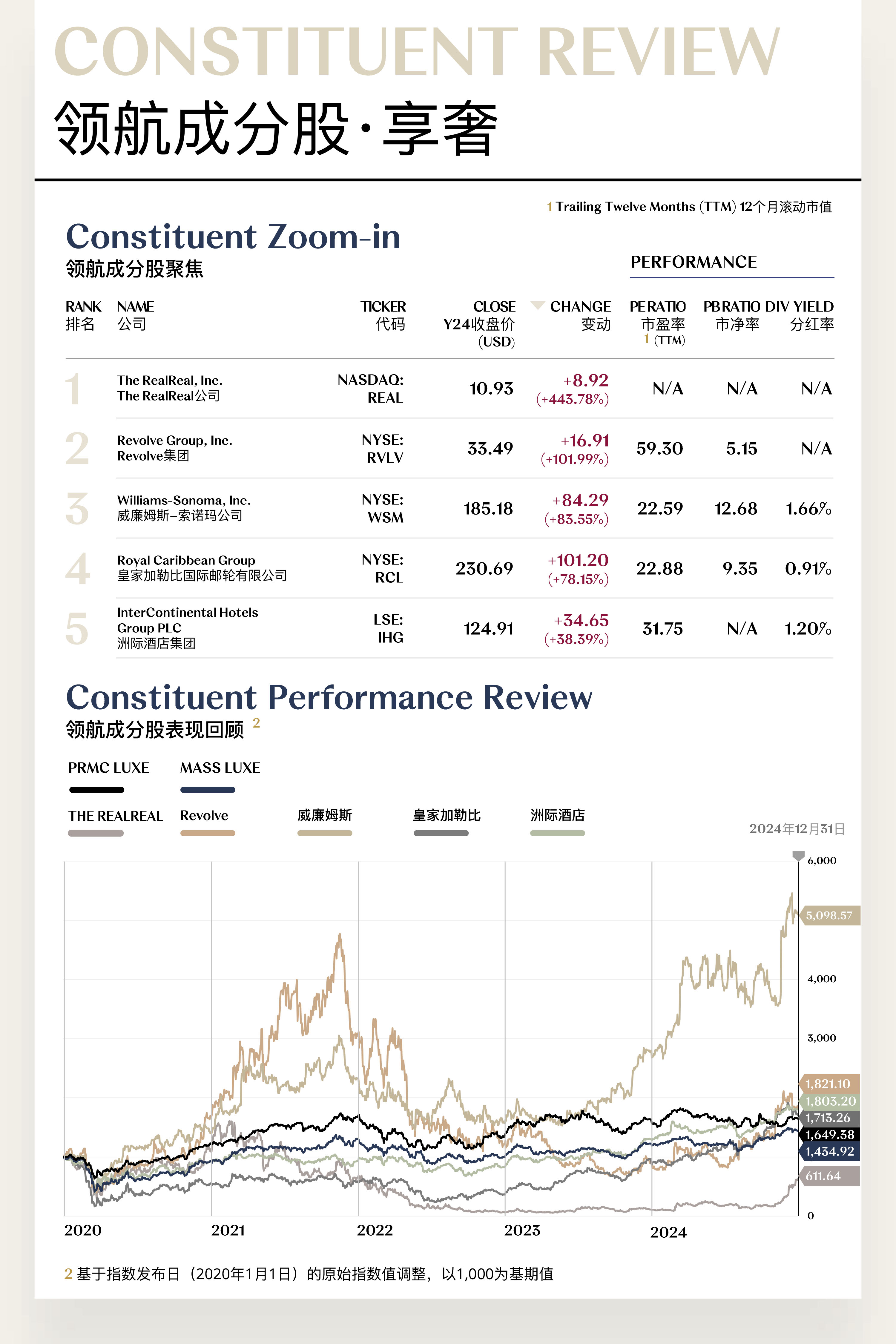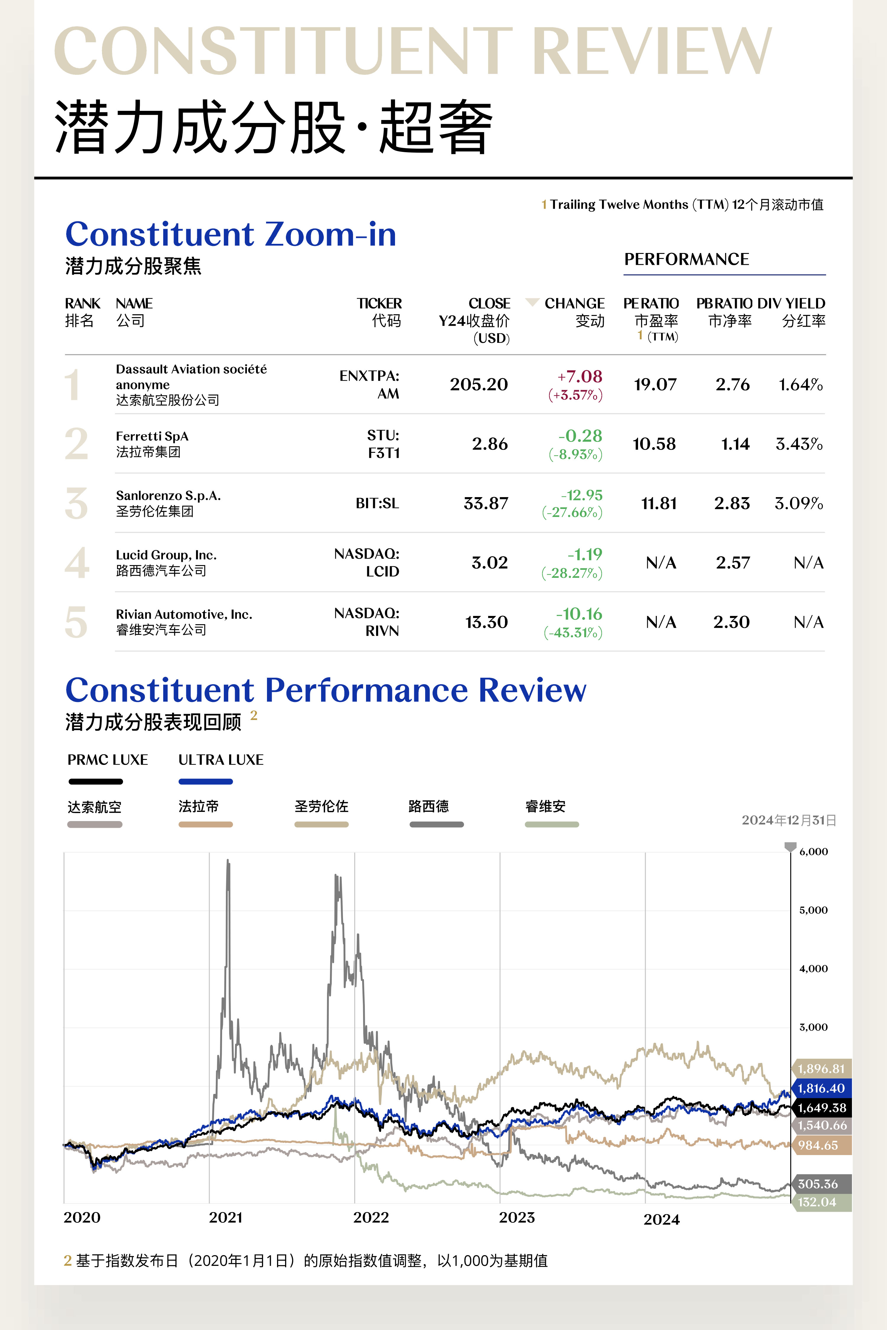 Premier通过聚焦溥元奢侈品指数(PRMC Luxe Index)中4支二级指数重点成分股表现(即超奢Ultra Luxe、精奢Core Luxe、众奢Mass Luxe、享奢Experiential Luxe),辅以指数动向分析,以数据为矢,为投资者划开市场迷雾,在波动性叙事中捕捉确定性跃迁路径。