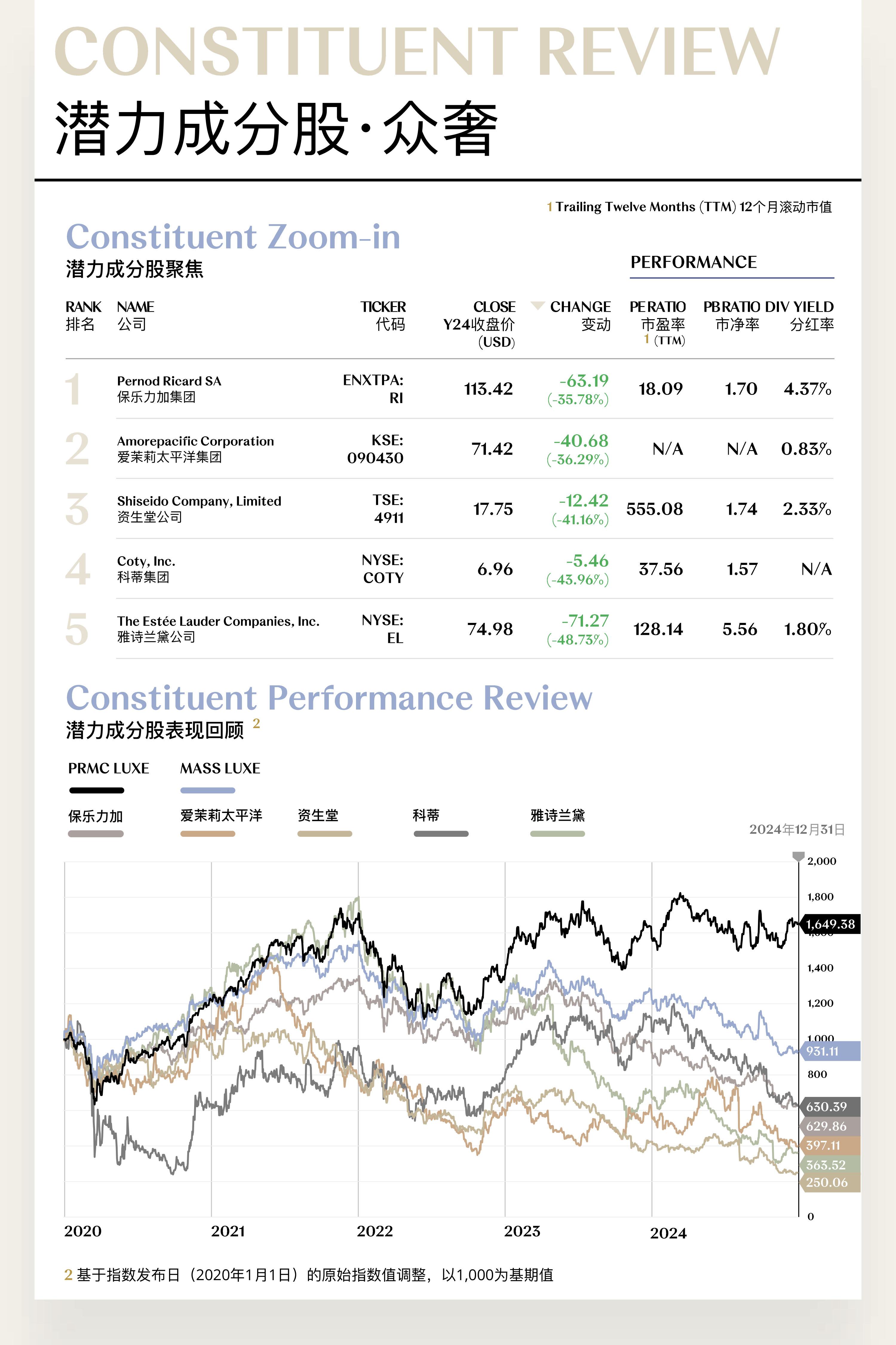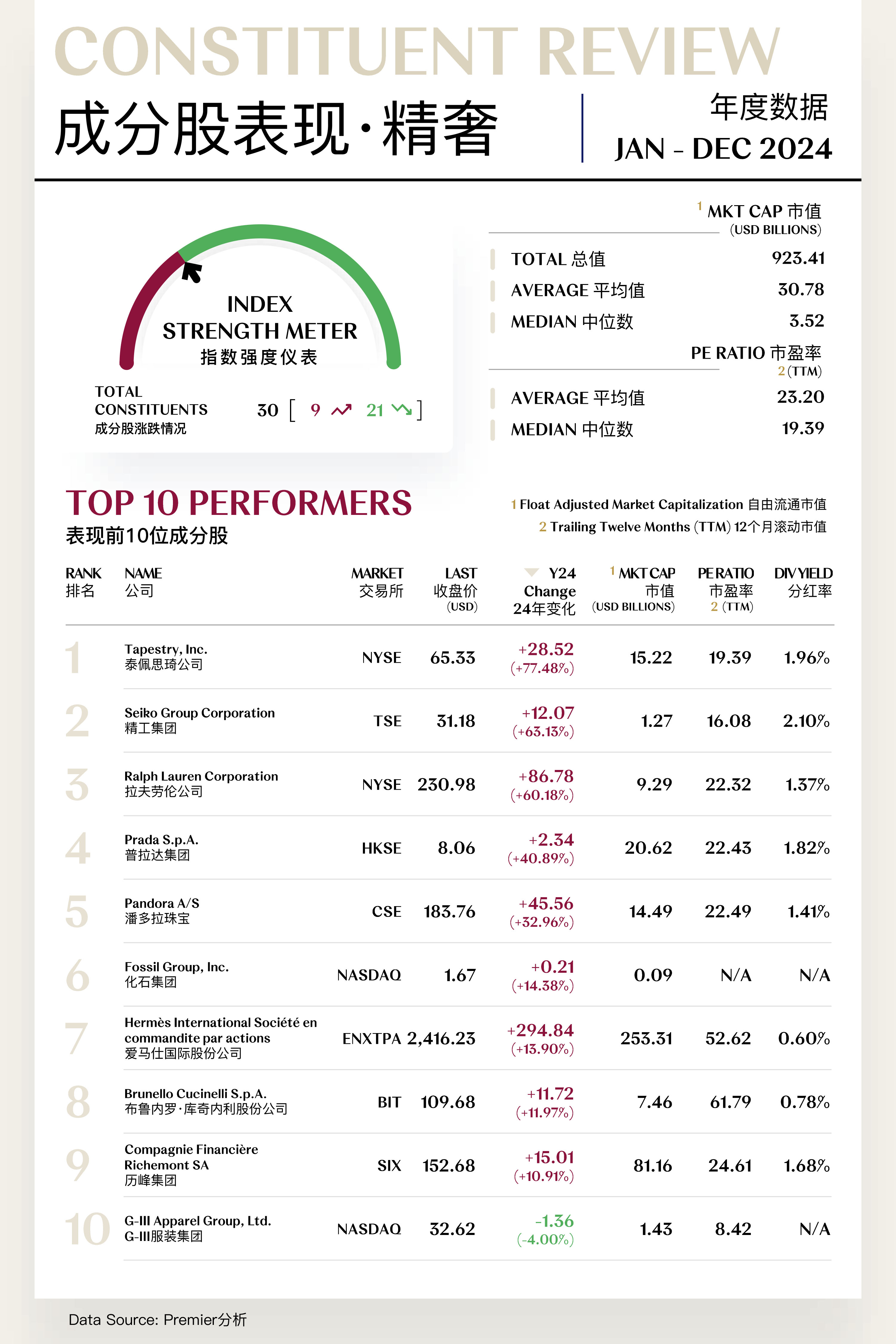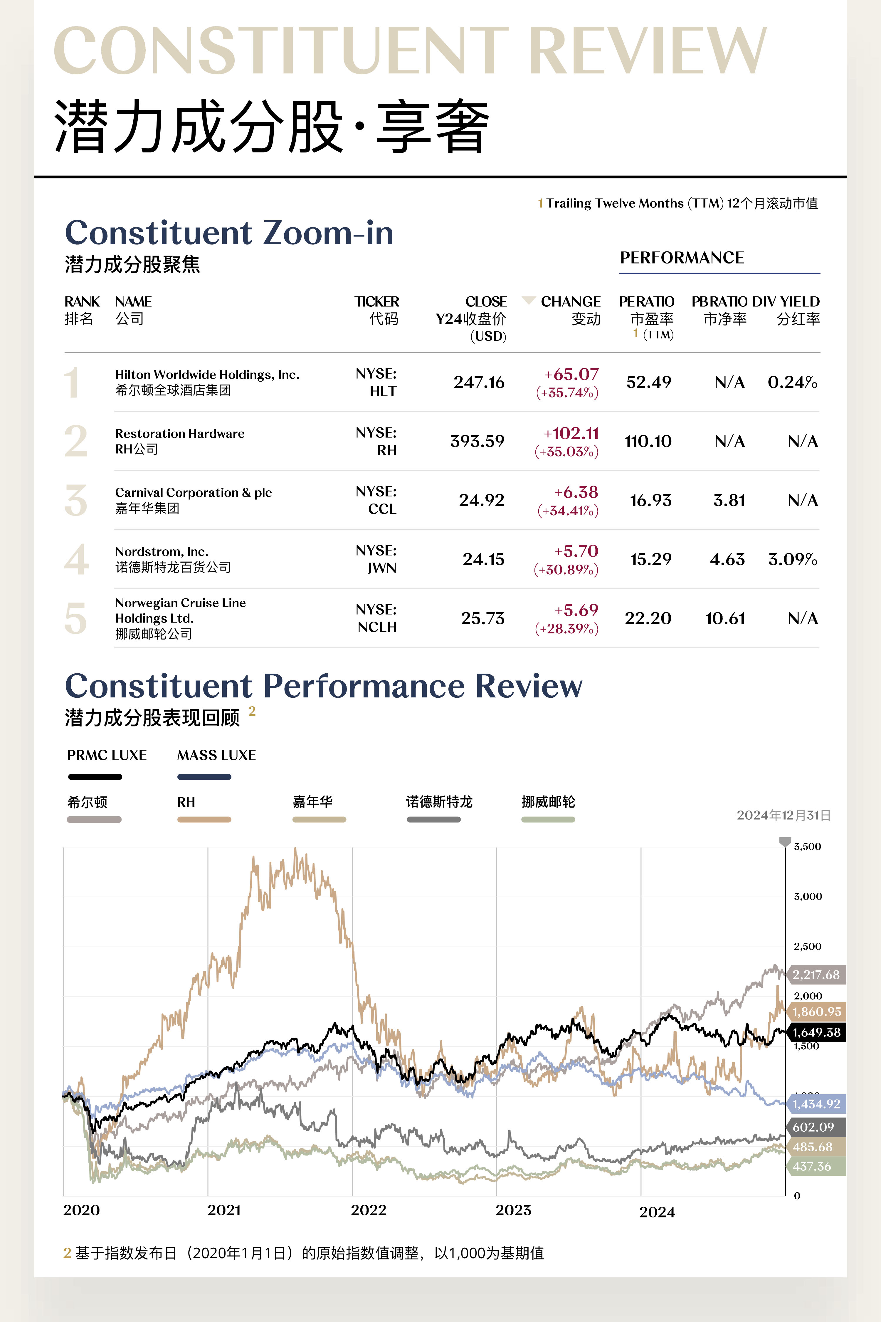 10月至12月,市场情绪逐渐趋于理性,前期指数的快速上涨得到修正。同时,全球货币宽松的步伐未曾停歇。美联储在11月和12月分别降息25个基点,欧洲央行则在10月和12月两次下调主要利率。中国政府进一步推进消费刺激政策,更大力度的消费品“以旧换新”支持措施在一定程度上促进了奢侈品消费。受上述利好因素的驱动,奢侈品指数在11月中旬再度回升至1,600点以上,高于年初水平。