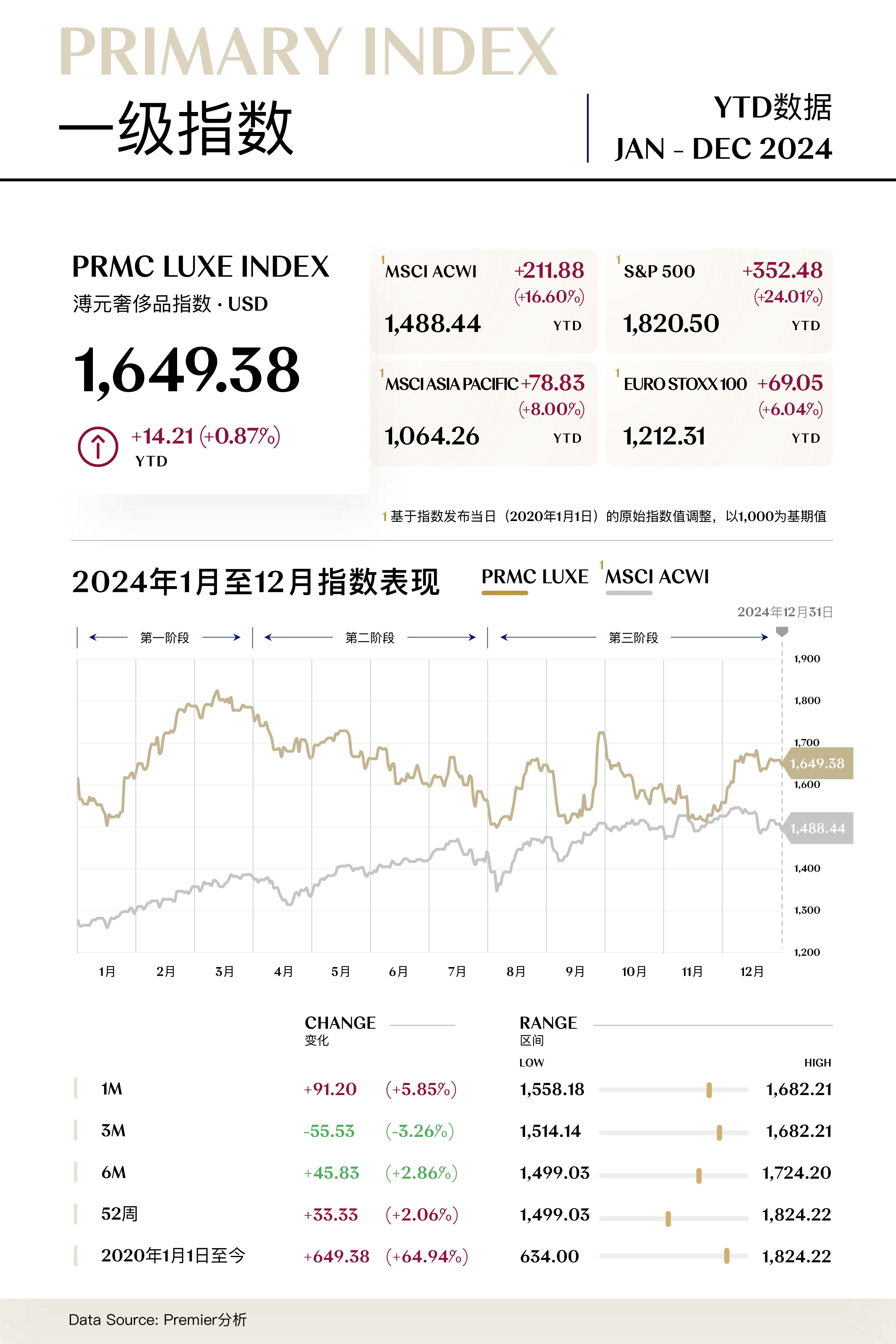 2024年溥元奢侈品指数收于1,649.38点,较年初上涨14.21点,同比上升0.87%。回顾全年指数运行态势,可分为以下三个阶段: