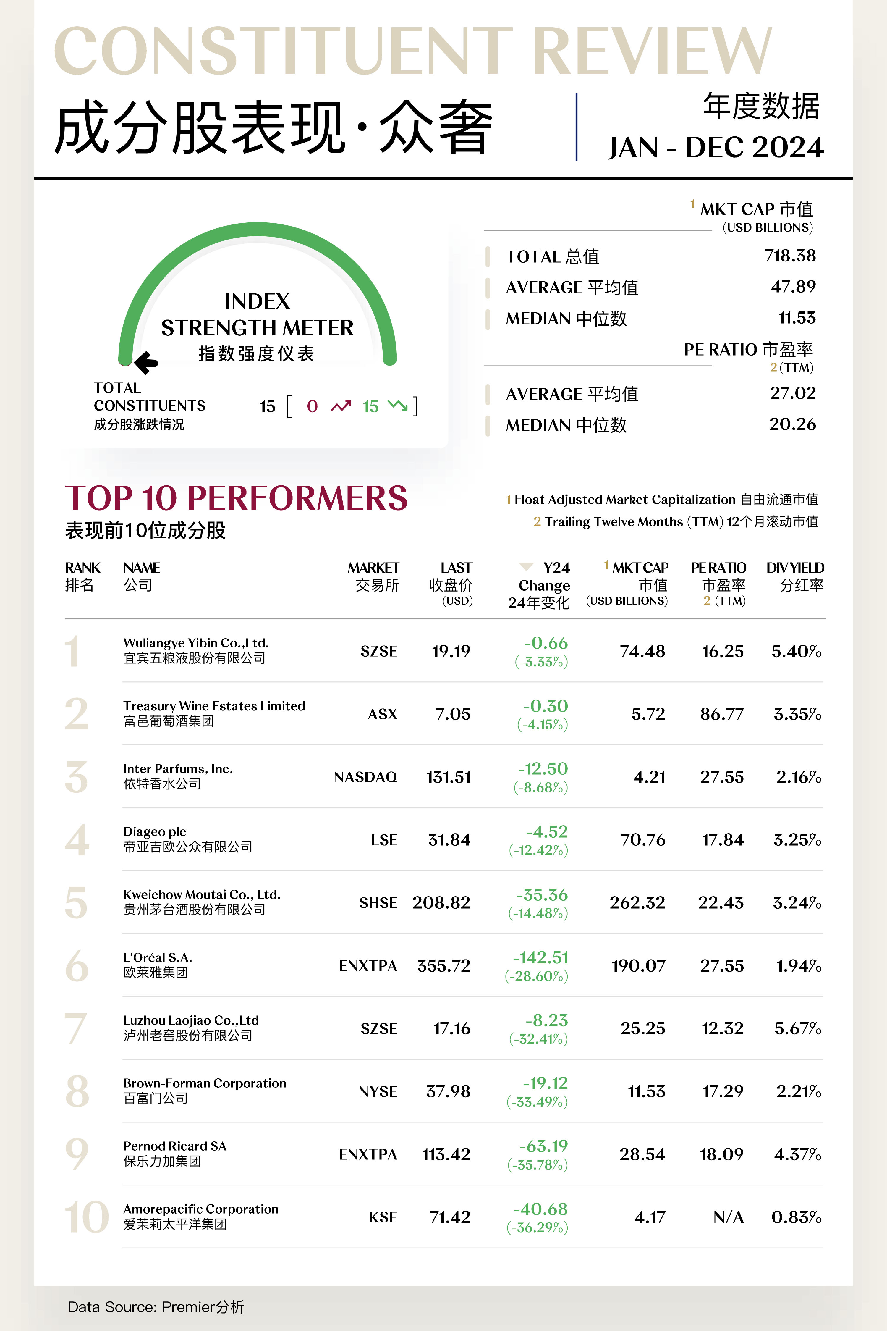 精奢指数全年收于1,862.40点,较年初下跌22.38点,同比下滑1.19%。精奢指数受公司财报发布影响,于2至3月持续上升,并于3月中突破2,200点。而后在全球奢侈品市场需求趋缓的大背景下,精奢指数自4月起进入震荡下行阶段。8月至9月期间,市场受新一轮政策发布的积极预期影响,LVMH、爱马仕等大权重成分股股价有所反弹,带动指数短暂重回2,000点区间。但随着市场情绪降温及后续消费复苏力度不及预期,股价再度回落,指数表现整体疲弱。尽管11月中旬起市场情绪有所改善,精奢指数小幅企稳回升,但全年表现仍略低于年初水平。