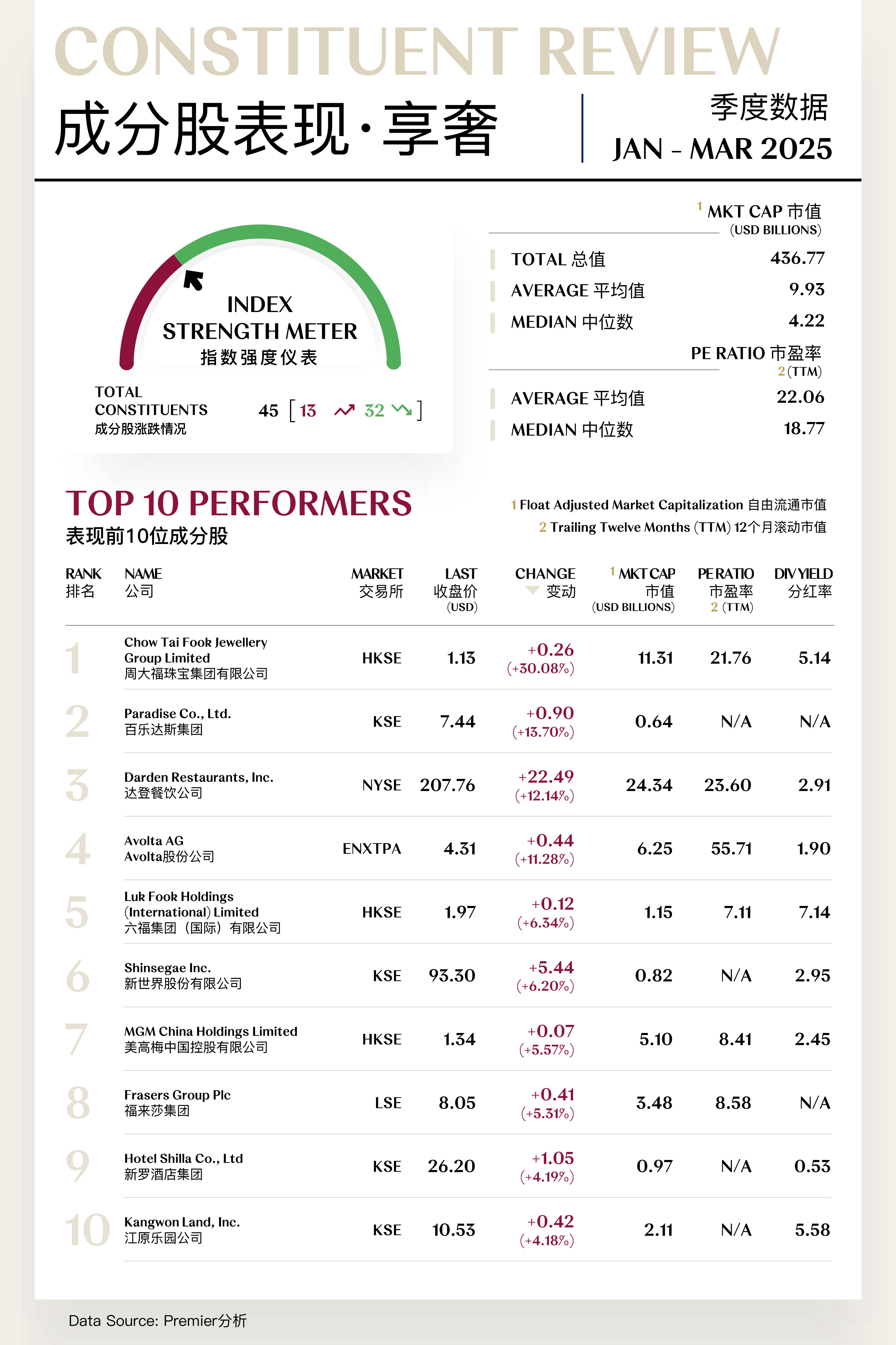 享奢指数(Experiential Luxe Index)共包括45支个股,其中13支上涨,32支下跌。