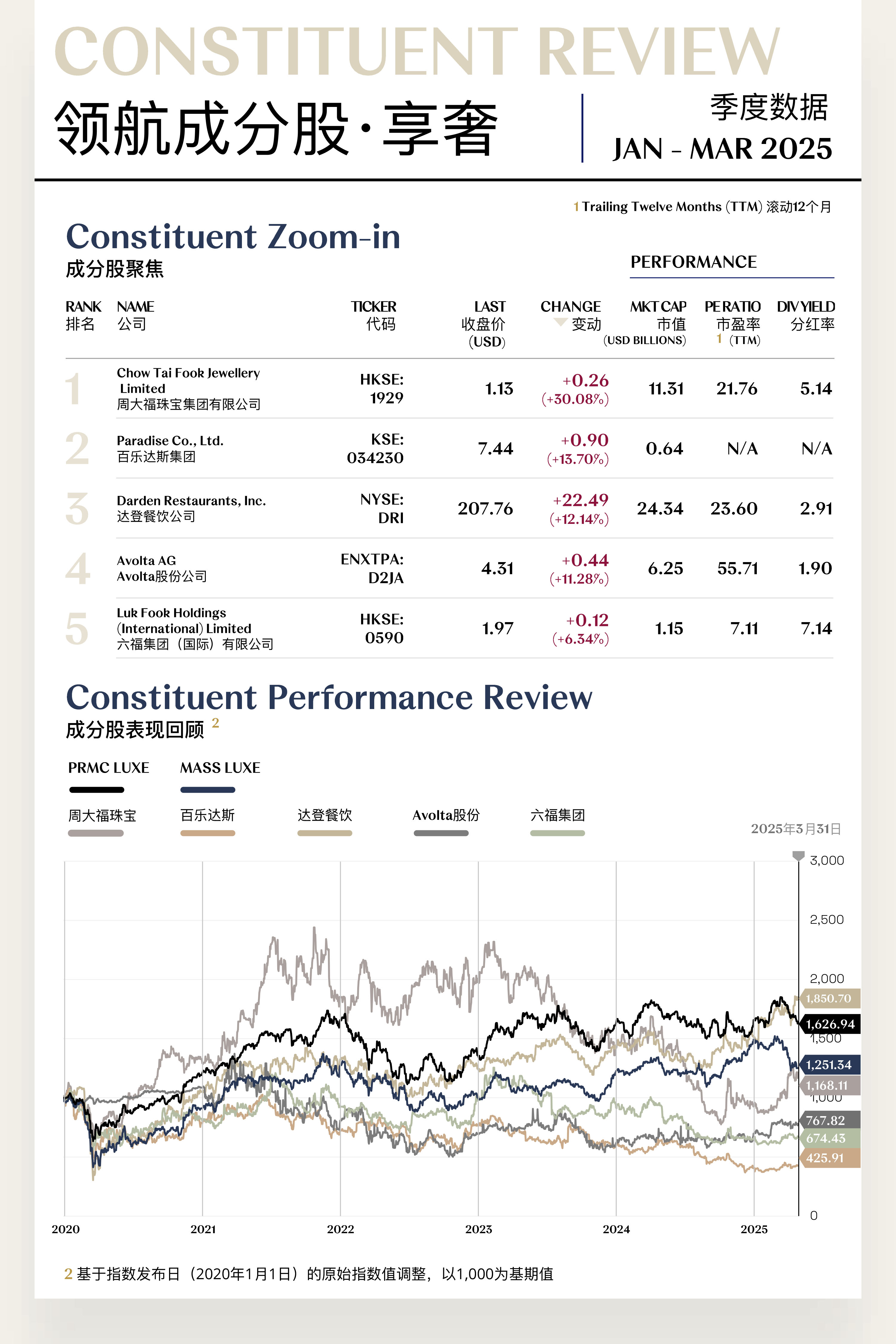 精奢指数收于1,900.56点,季内上涨38.17点,涨幅为2.05%,为一季度涨幅最大二级指数。季度初,精奢板块延续2024年四季度的回暖趋势,市场信心修复带动指数稳步攀升,并于2月中旬一度突破2,200点重要关口。然而,随着特朗普政府重新启动关税政策,叠加投资者对美联储政策走向及宏观经济前景的担忧升温,市场风险偏好逐步回落。同时,LVMH等头部精奢企业陆续披露的2024年财报整体表现不及预期,也对估值端形成压制。3月指数震荡回落,最终回调至1,900点附近。展望二季度,在外部政策不确定性依旧高企、全球消费修复节奏放缓的大背景下,精奢板块或将面临估值重估压力,指数预计延续震荡态势。