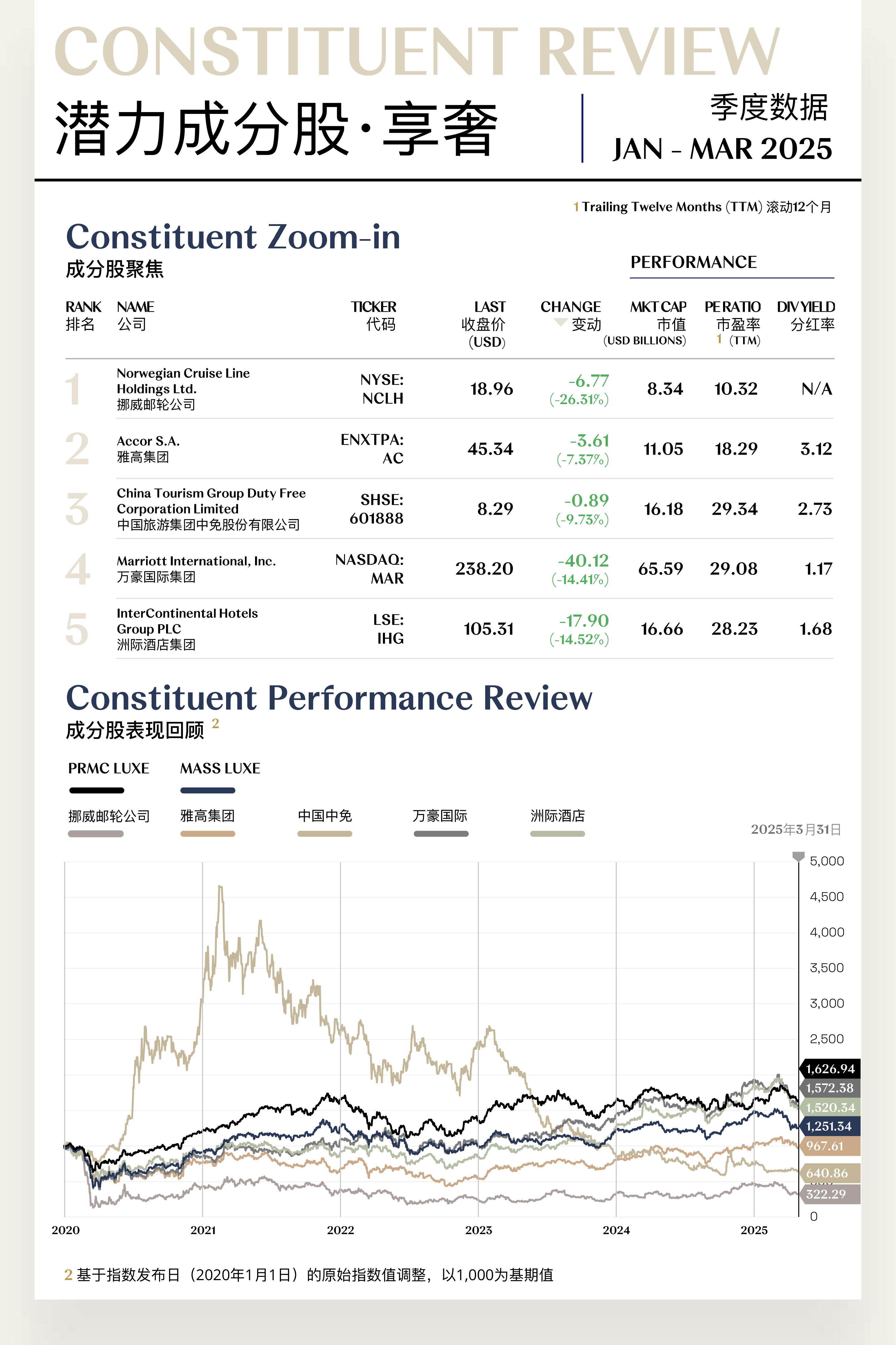 享奢指数收于1,251.34点,季内下跌183.58点,跌幅为12.79%,为一季度跌幅最大二级指数。享奢板块此前长期受益于全球旅游市场复苏及体验型消费趋势的深化,表现强劲。然而,自2025年2月起,全球地缘政治紧张局势升温,叠加国际贸易摩擦加剧,尤其是航运及跨境出行受限,对酒店、邮轮等高体验型服务行业构成直接冲击,显著抑制了投资者情绪并引发指数加速回调。展望二季度,尽管市场信心修复尚需时间,但在体验型消费逐步修复的带动下,指数有望进入震荡回升通道。