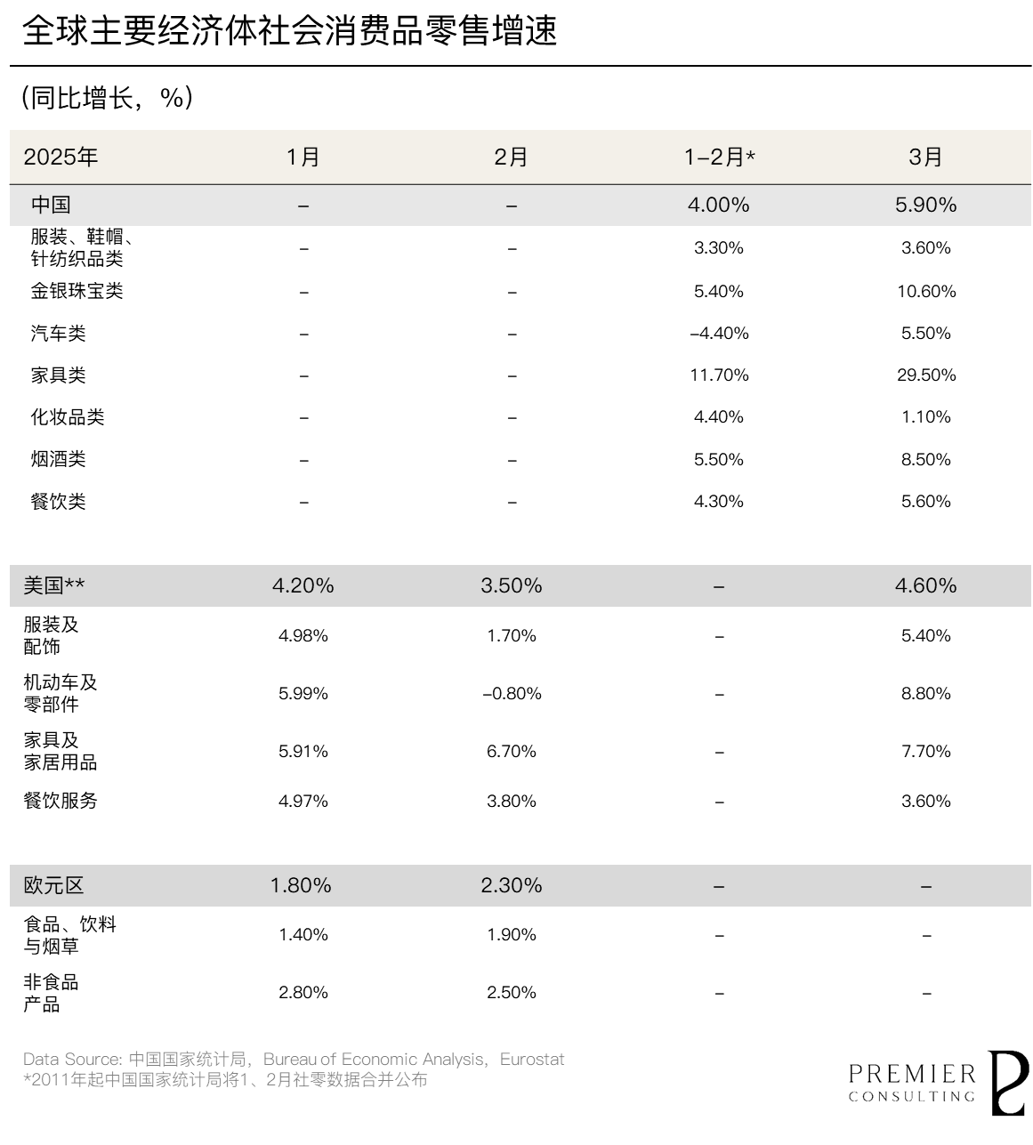 2025年3月,我国社会消费品零售总额达40,940亿元,同比增长5.9%。其中,服装、鞋帽、针纺织品类和金银珠宝类零售额分别同比增长3.6%和5.5%。2025年一季度累计社会消费品零售总额为124,671亿元,同比增长4.6%,服装鞋帽类与金银珠宝类分别录得3.4%和6.9%的增速。与此同时,3月CPI环比下降0.4%、同比下降0.1%,降幅明显收窄,价格水平趋于稳定。回顾一季度,国家聚焦扩大内需与提振消费,出台多项政策组合拳。安排3,000亿元超长期特别国债,支持消费品以旧换新,同时印发《提振消费专项行动方案》,从“增收减负”“优化供给”“营造良好环境”三方面系统性提升居民消费能力与意愿,推动市场信心回暖。展望二季度,随着相关政策持续释放效能,叠加文化IP消费、银发经济及数字经济的多点驱动,国内消费市场有望延续温和扩张态势,进一步巩固其作为拉动经济增长的核心动能。