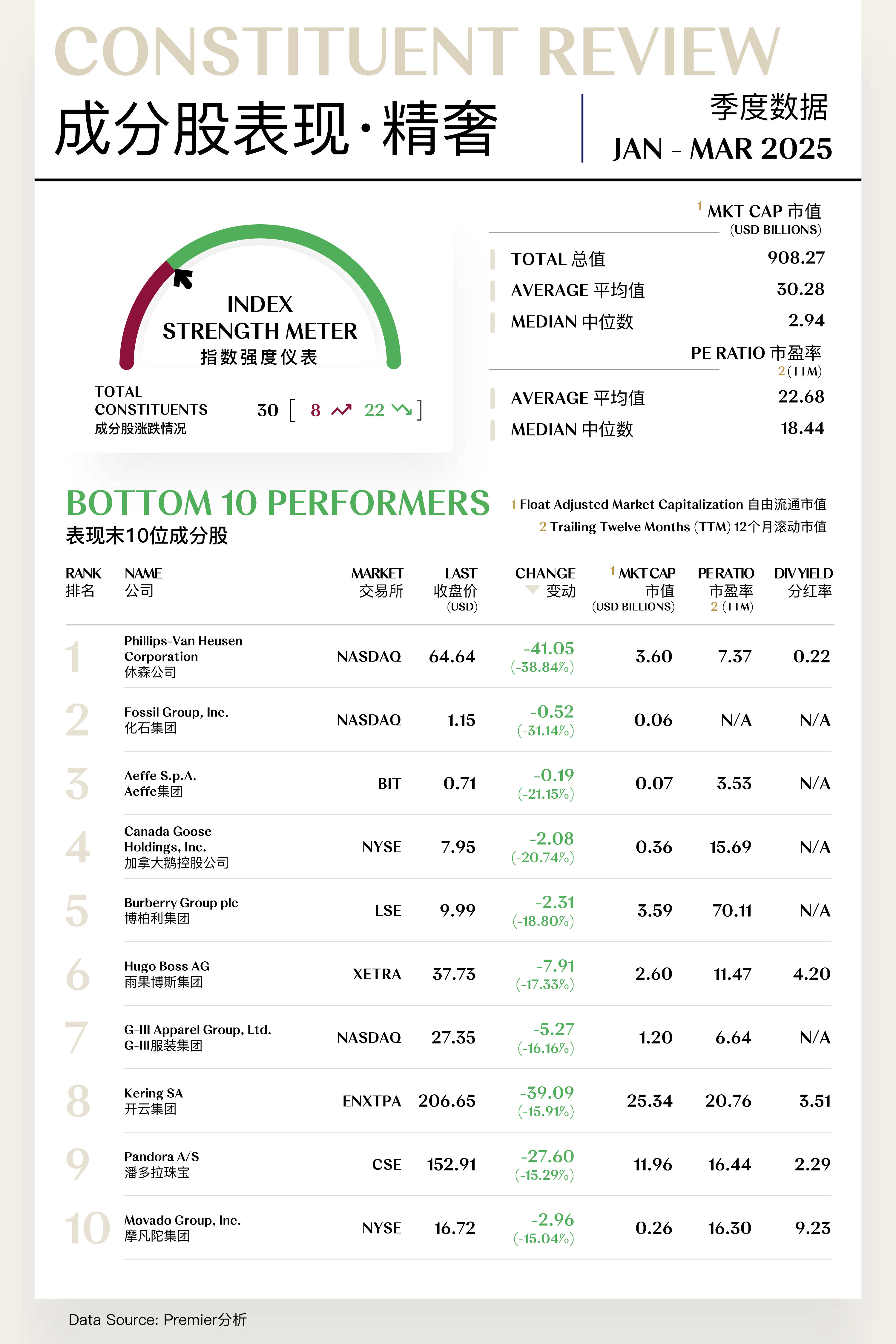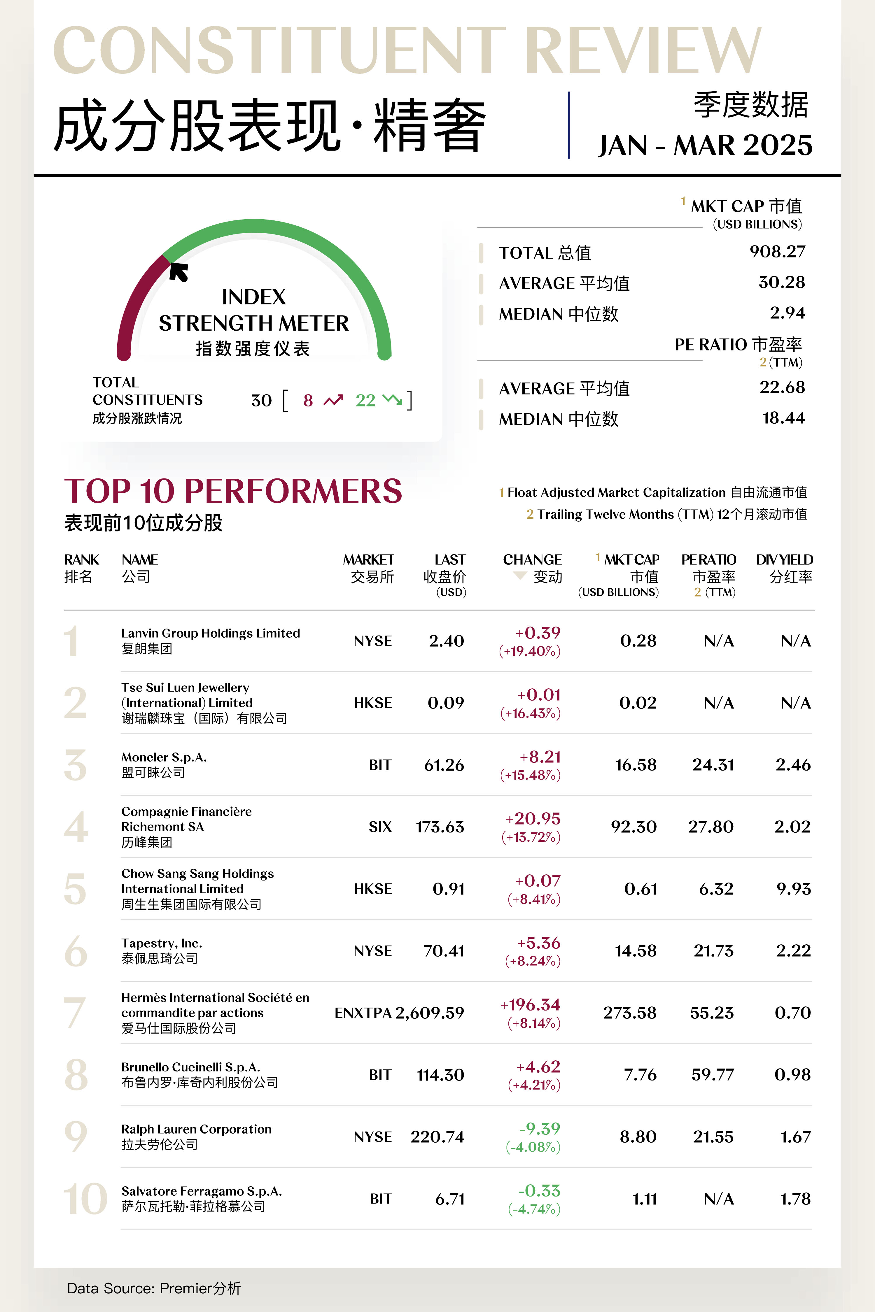精奢指数(Core Luxe Index)共包括30支个股,其中8支上涨,22支下跌。