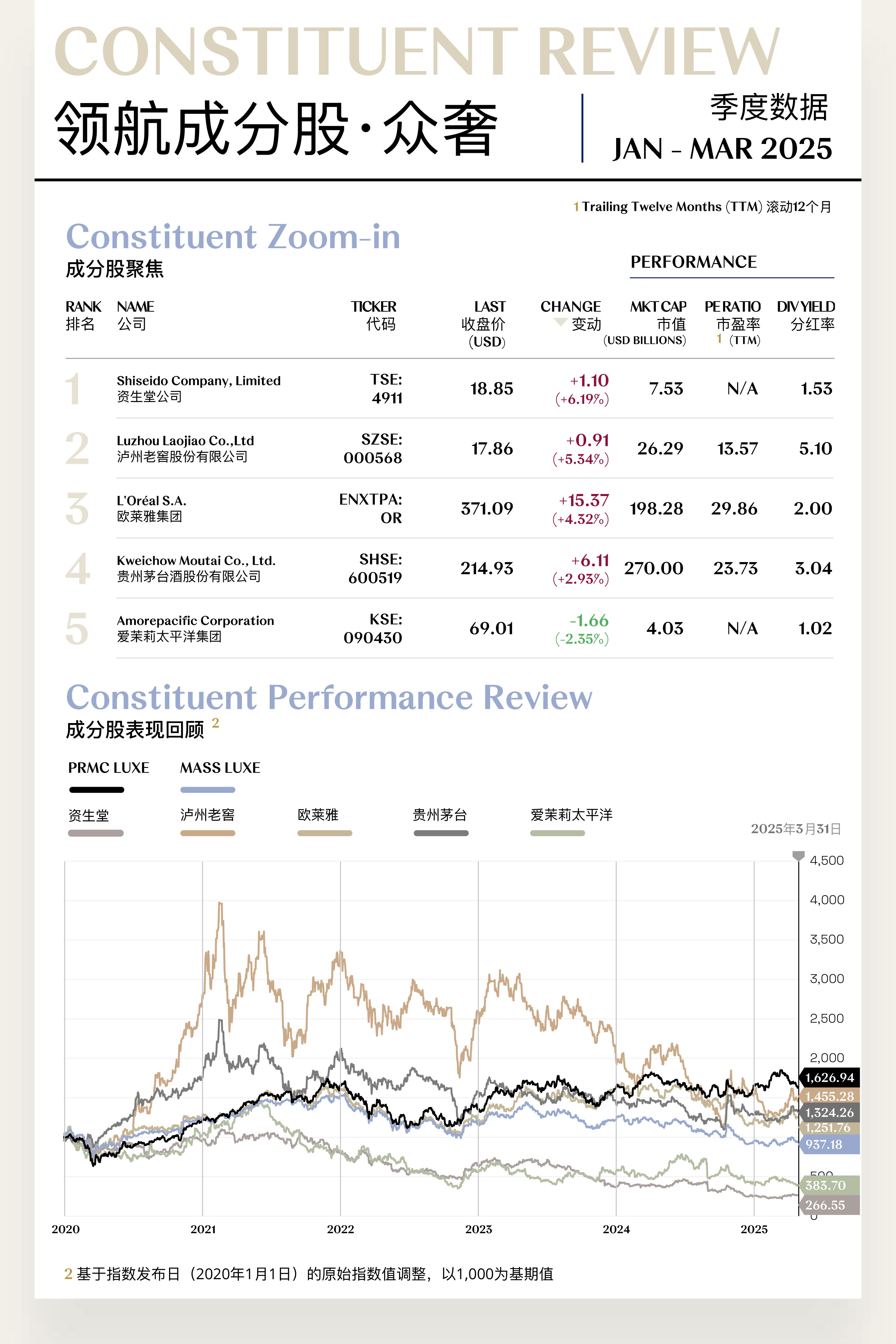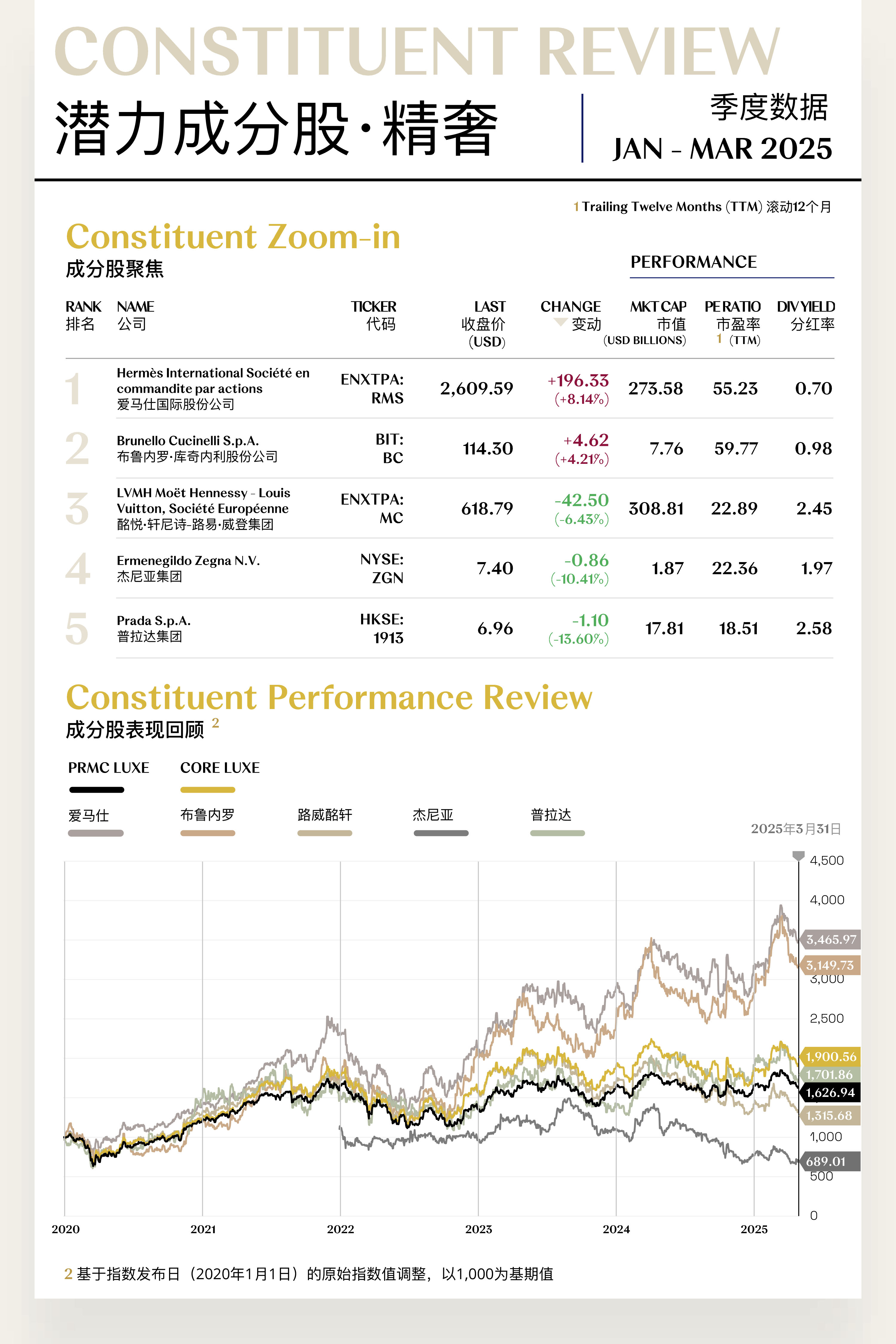 溥元奢侈品指数(PRMC Luxe Index)第一季度收于1,626.94点,季内下跌22.44点(-1.36%),表现逊于MSCI ASIA PACIFIC及EURO STOXX 100,但优于MSCI ACWI及S&P 500等全球主要指数。二级指数方面,精奢指数(+2.05%)逆势上行,众奢指数(+0.65%)运行稳定,超奢指数(-4.10%)略有下行,享奢指数(-12.79%)则大幅回退。