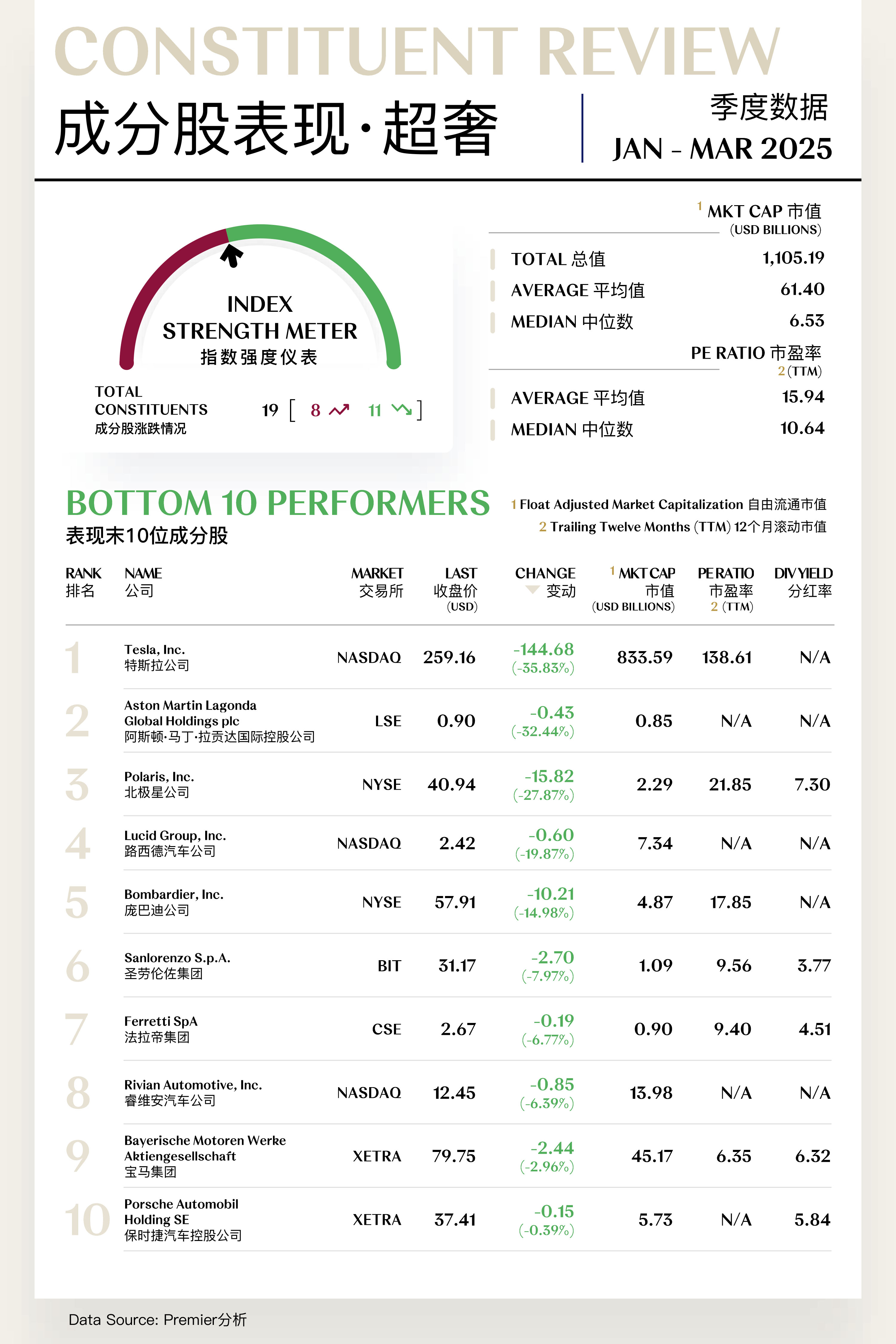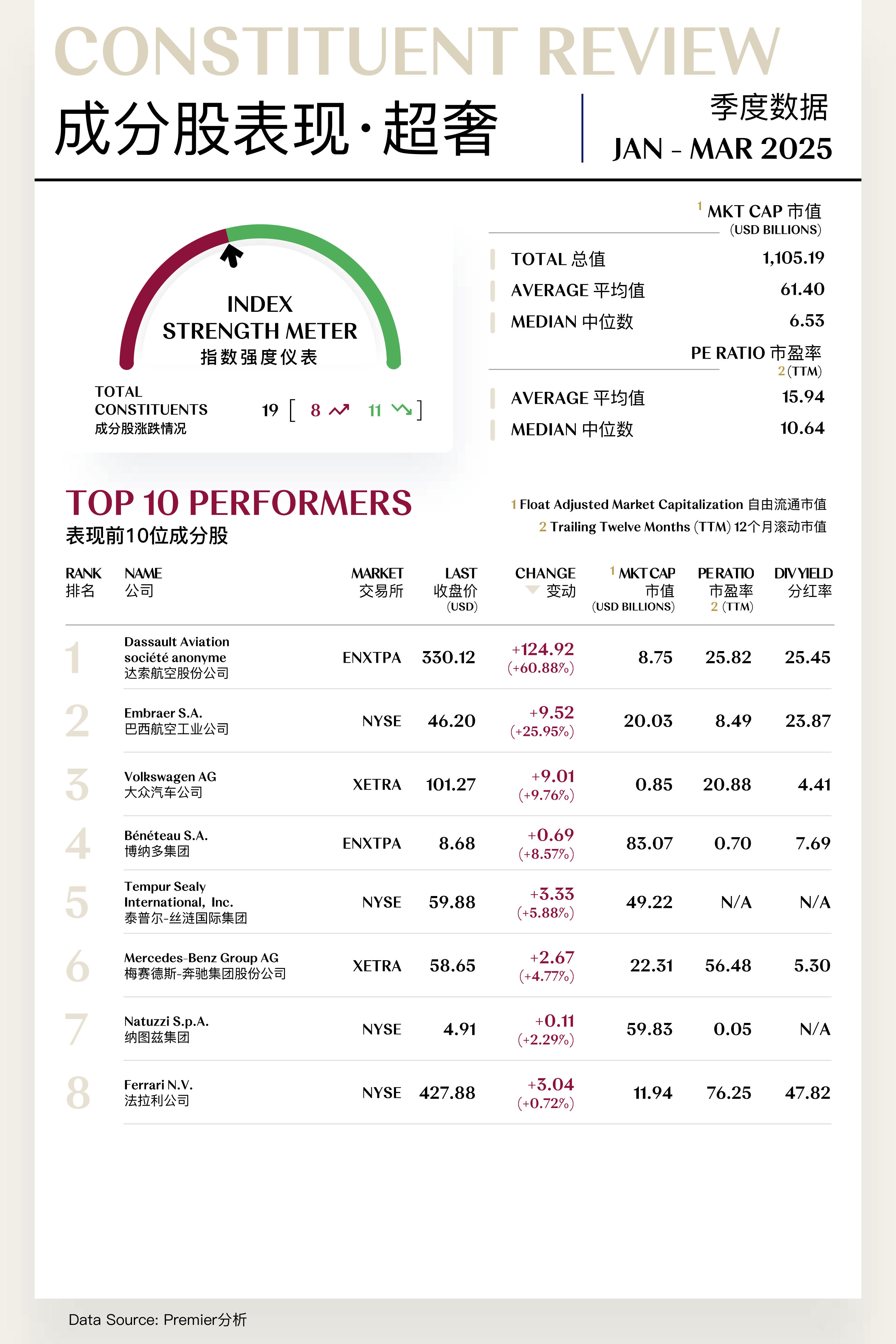 放眼个股表现,一季度各企业表现分化显著。达索航空、历丰集团、爱马仕等表现突出,股价迎来上涨,特斯拉、博柏利、人头马君度等则表现欠佳,股价逊于年初表现。