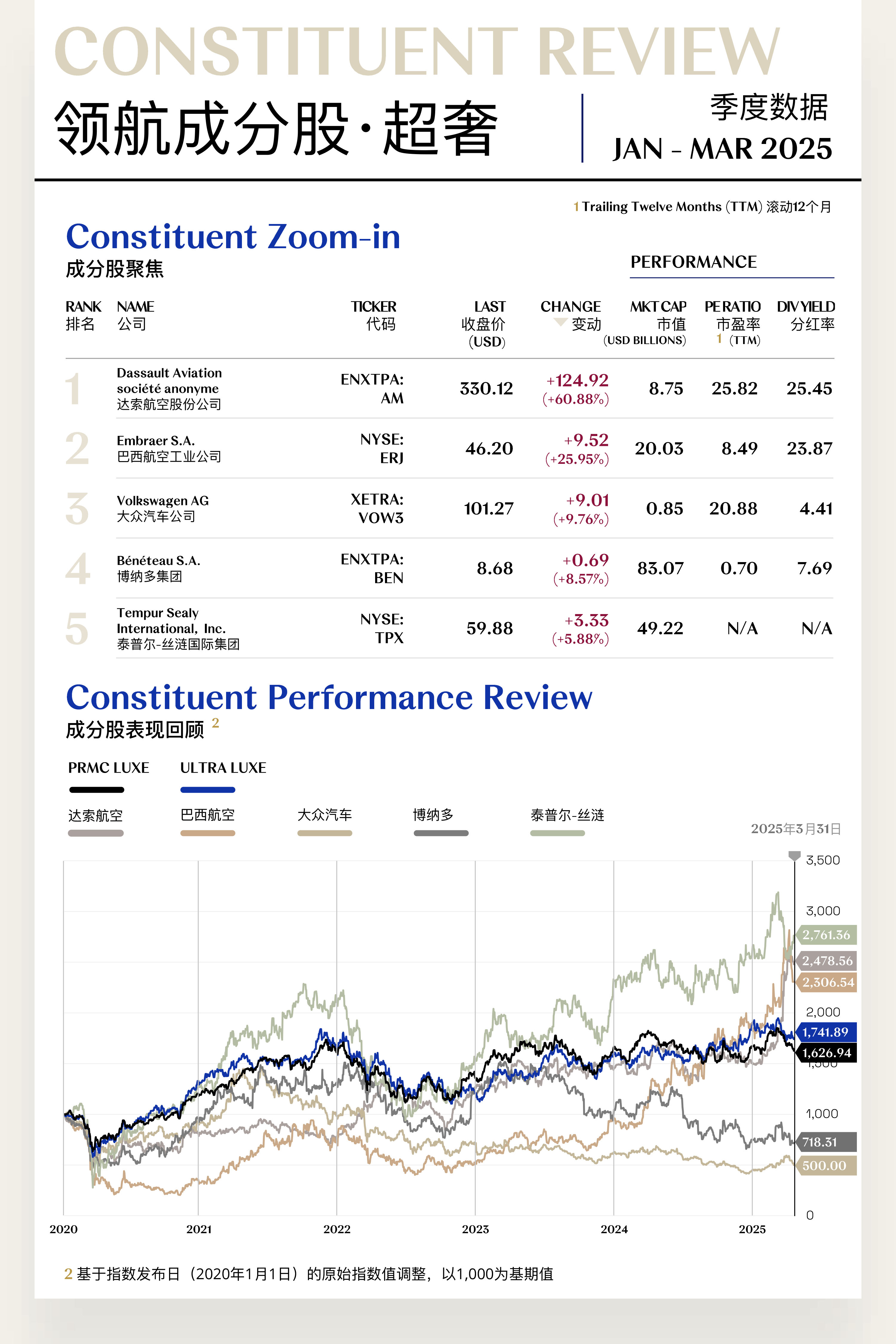 超奢指数于2025年第一季度收于1,741.89点,季度内下跌74.51点,跌幅为4.10%。尽管整体承压,该板块在季初延续稳健态势,季末受宏观扰动影响略有回调。面对高利率与地缘不确定性等外部挑战,超高端奢侈品牌凭借稳固的高净值客户基础与可观的订单储备,在一定程度上稳定了市场预期。同时,私人航空、超级游艇等超奢细分市场持续回暖,为指数提供了结构性支撑。展望第二季度,随着全球高端消费需求逐步修复,叠加部分品牌新产品周期的驱动,超奢指数或将延续震荡筑底态势,具备阶段性企稳与回升的潜力。
