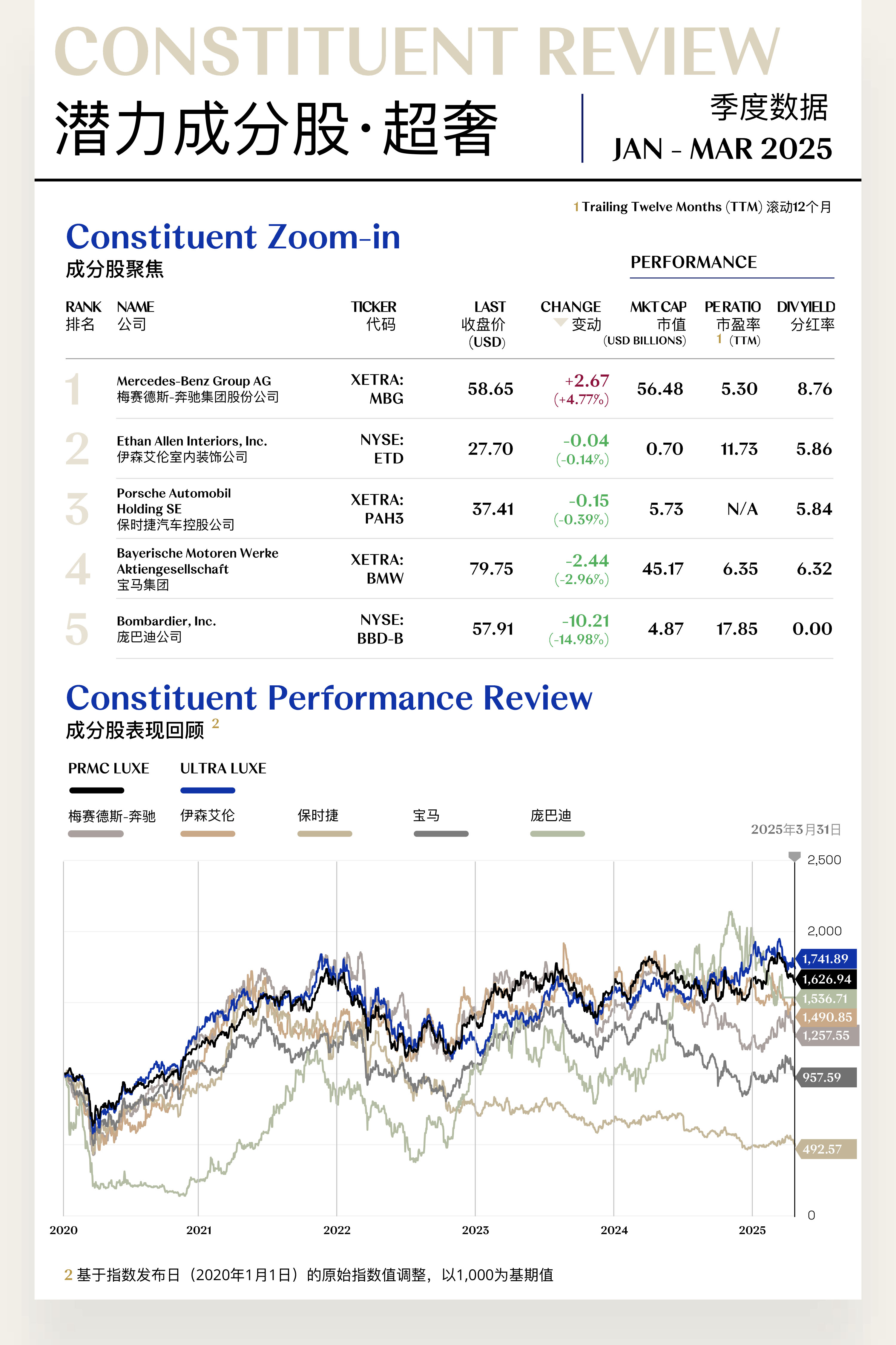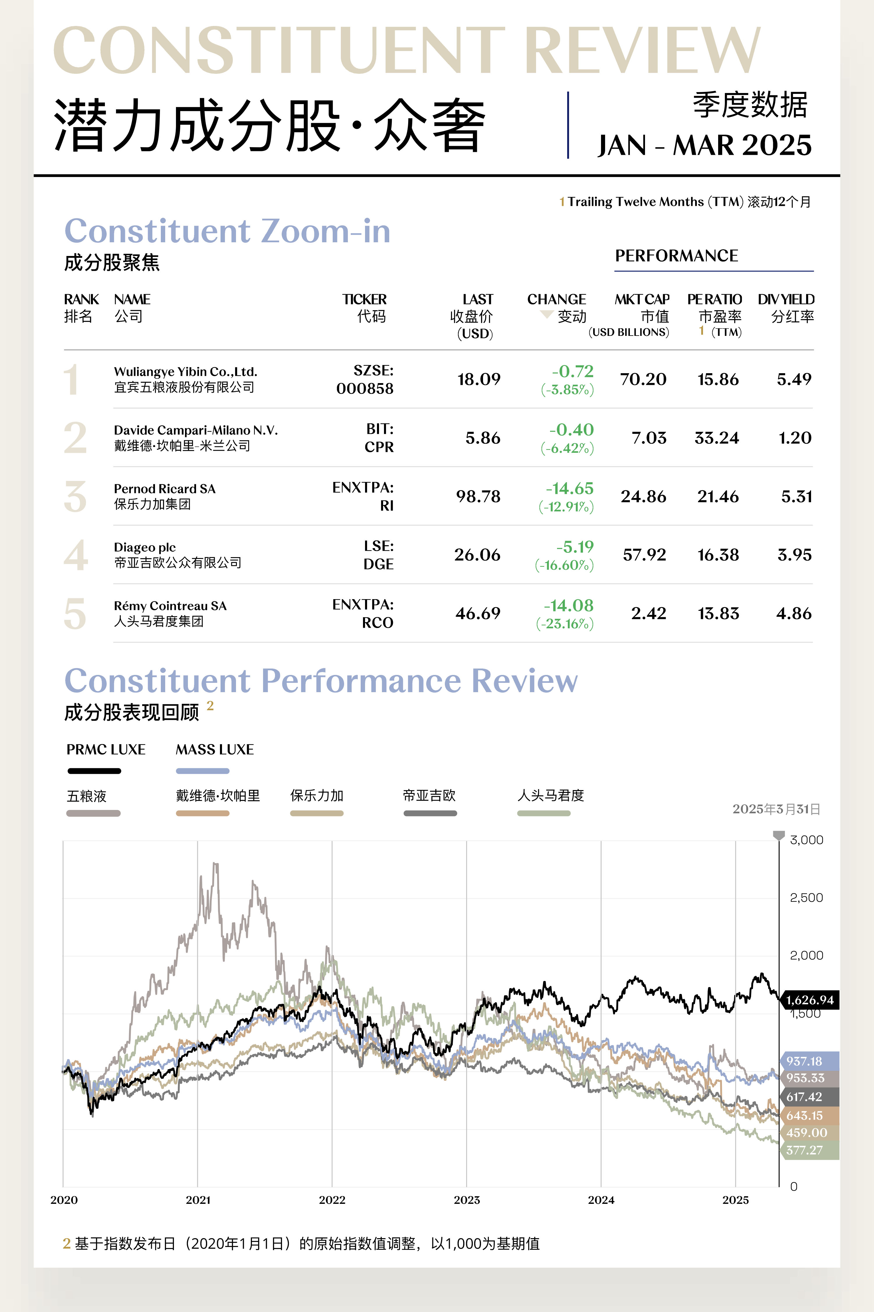2025年第一季度,溥元奢侈品指数收于1,626.94点,季度内下跌22.44点,跌幅为1.36%。年初,受全球市场乐观情绪延续、美联储官员释放降息信号等利好因素提振,指数自1月中旬起出现温和上涨。然而,3月单月指数大跌159.34点(-8.92%),不仅回吐前期涨幅,也结束了本轮阶段性反弹行情。
