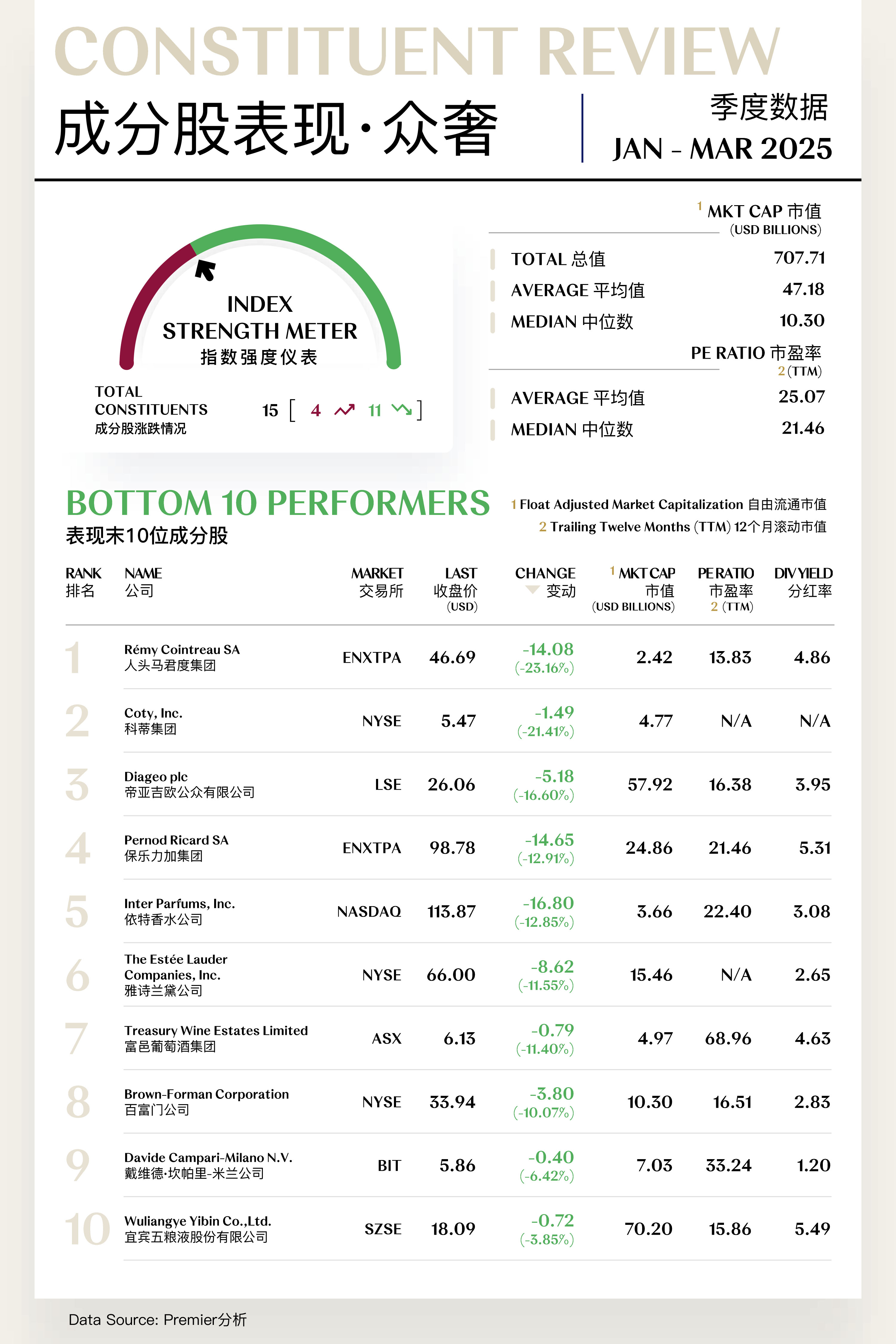 宜宾五粮液是中国领先的高端白酒制造商,专注于浓香型白酒的研发、生产与销售。公司旗下的核心产品“五粮液”被誉为中国浓香型白酒的代表。2025年第一季度,公司股价下跌0.72美元,收于18.09美元,季内跌幅达3.85%。