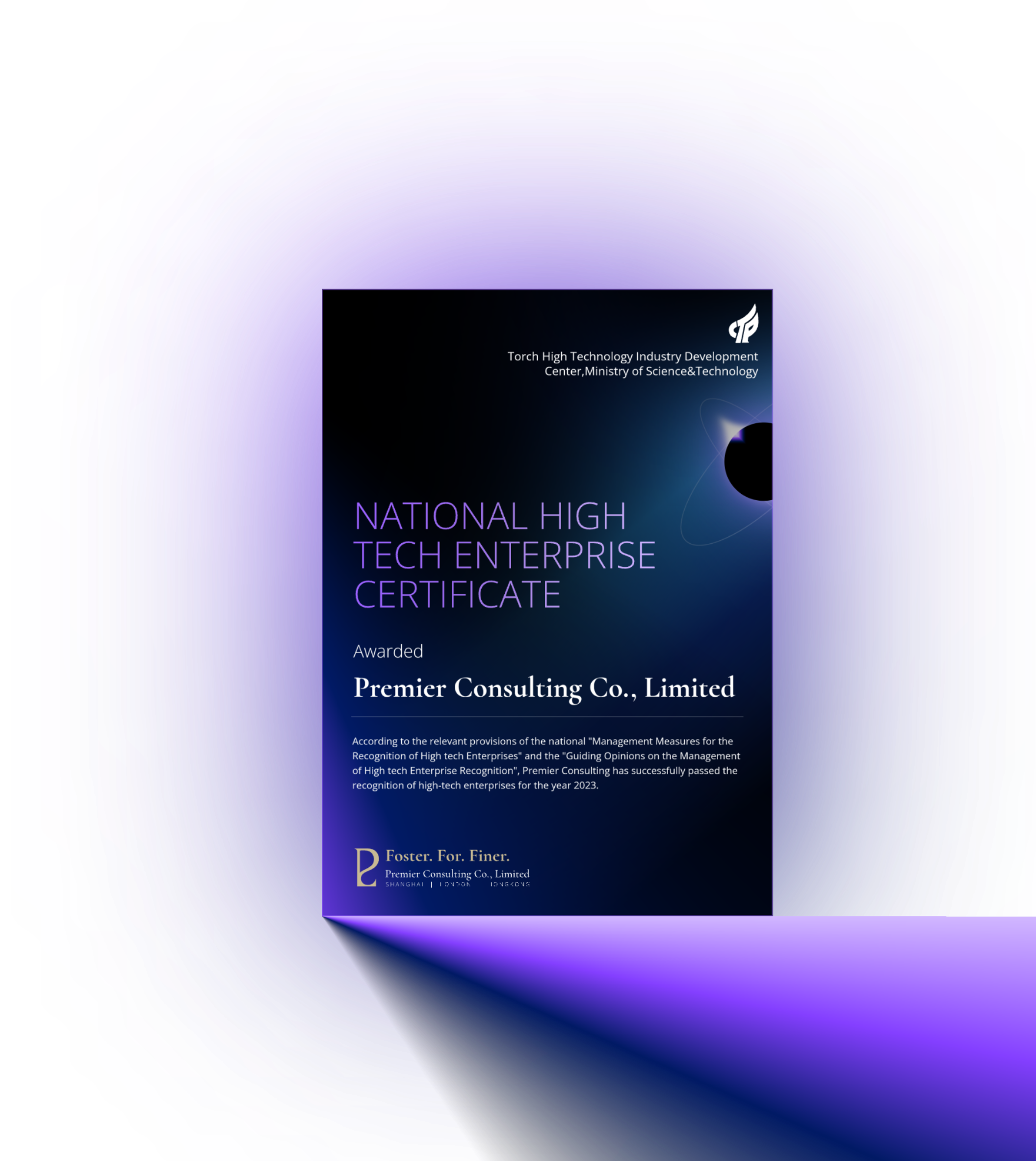 Premier Consulting is officially recognized as a National High-Tech Enterprise* — a distinguished certification that affirms our commitment to pioneering innovation across strategic consulting, data science, and digital enablement. This national designation reflects not only our robust R&D capability and IP output, but also our ability to apply advanced technologies in transforming enterprises, driving productivity, and shaping future competitiveness.