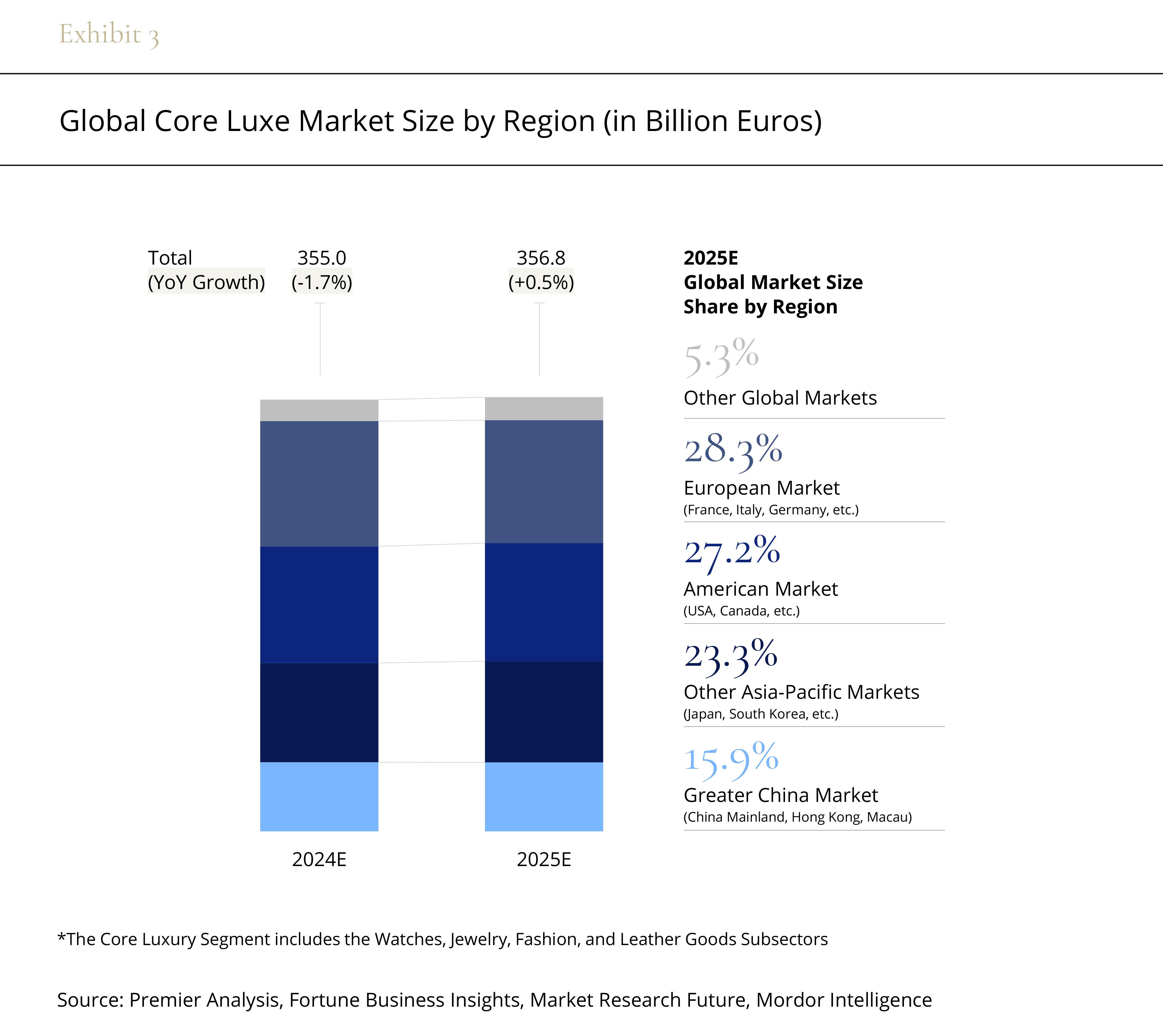 According to UBS‘s “Global Wealth Report 2024”, the number of ultra-high-net-worth individuals in the Asia-Pacific region is expected to grow at an annual rate of 13%, reaching one-third of the global total by 2027. Premier forecasts that the global high-end luxury market will reach €356.8 billion by 2025, with China (including Mainland China, Hong Kong, and Macau) maintaining a market share of 16%.
