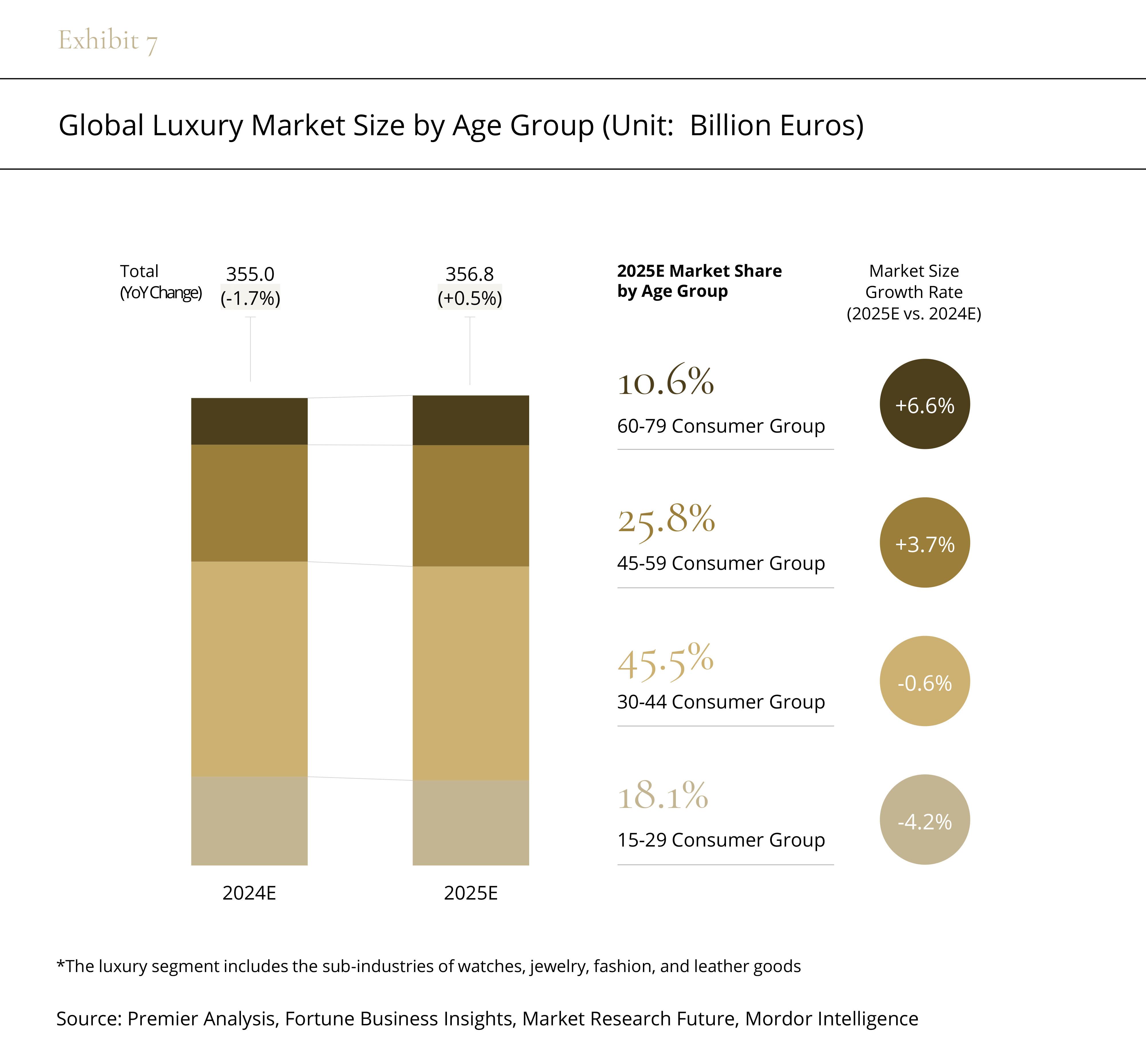 The generational landscape of luxury consumption is undergoing a notable shift. While Gen Z and Gen Y were once expected to be the primary growth engines, post-pandemic consumption patterns have reshaped market dynamics. Instead, the senior segment (ages 60–79) has emerged as the leading driver of luxury market expansion.