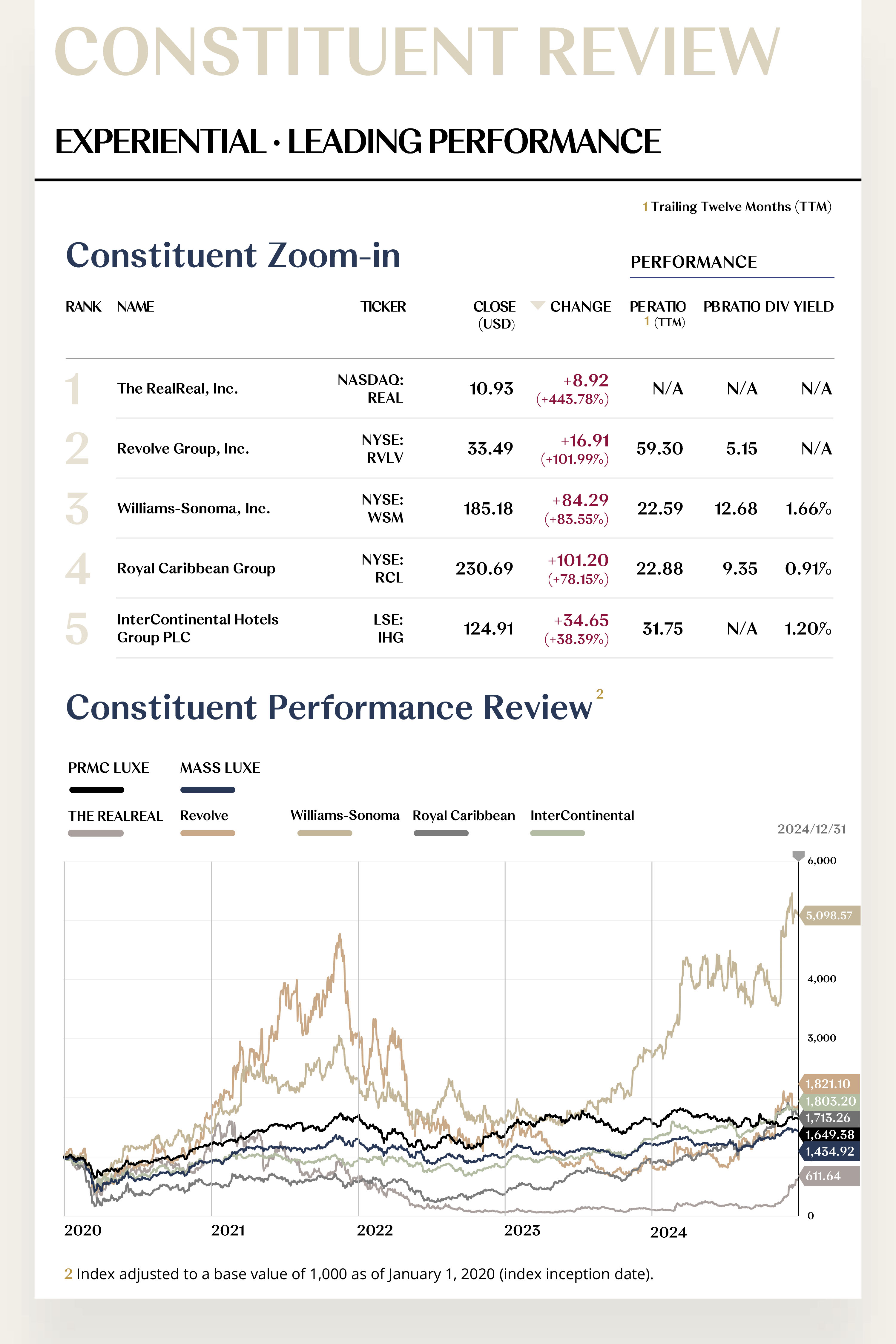 The Experiential Luxe Index comprises 45 stocks, with 22 rising and 23 falling.