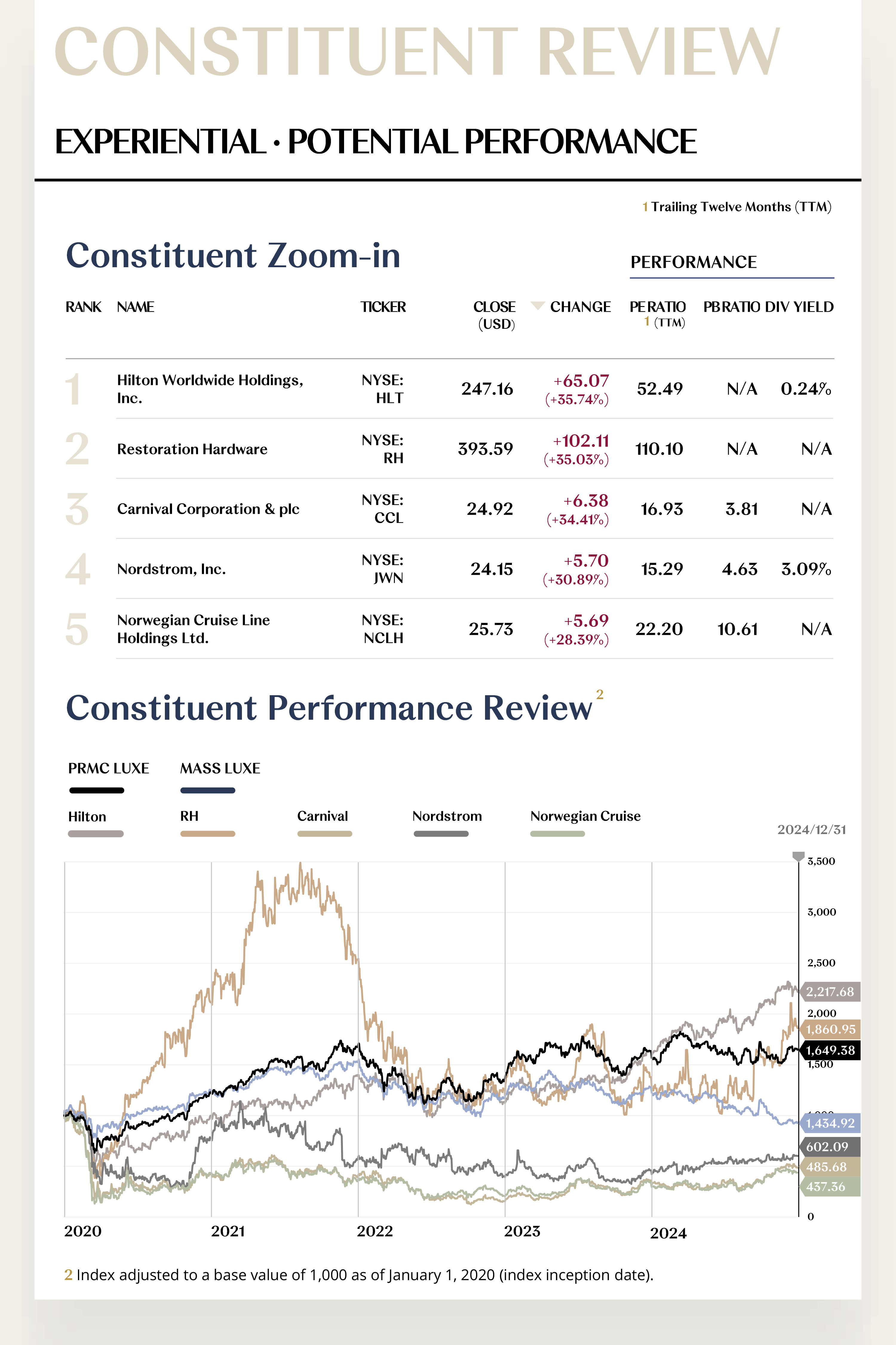 The Experiential Luxury Index closed the year at 1,434.92 points, up 208.12 points from the beginning of the year, marking a 16.96% year-over-year increase, the largest gain among secondary indices. Driven by the global rise of experiential consumption, strong performances from publicly listed companies in the cruise and retail sectors fueled stock price gains, boosting the index. Although geopolitical tensions from April to August temporarily dampened market confidence, leading to a brief pullback, the index entered a steady upward trajectory from September as the global economy recovered and consumer demand rebounded, nearing the 1,500-point threshold in December.