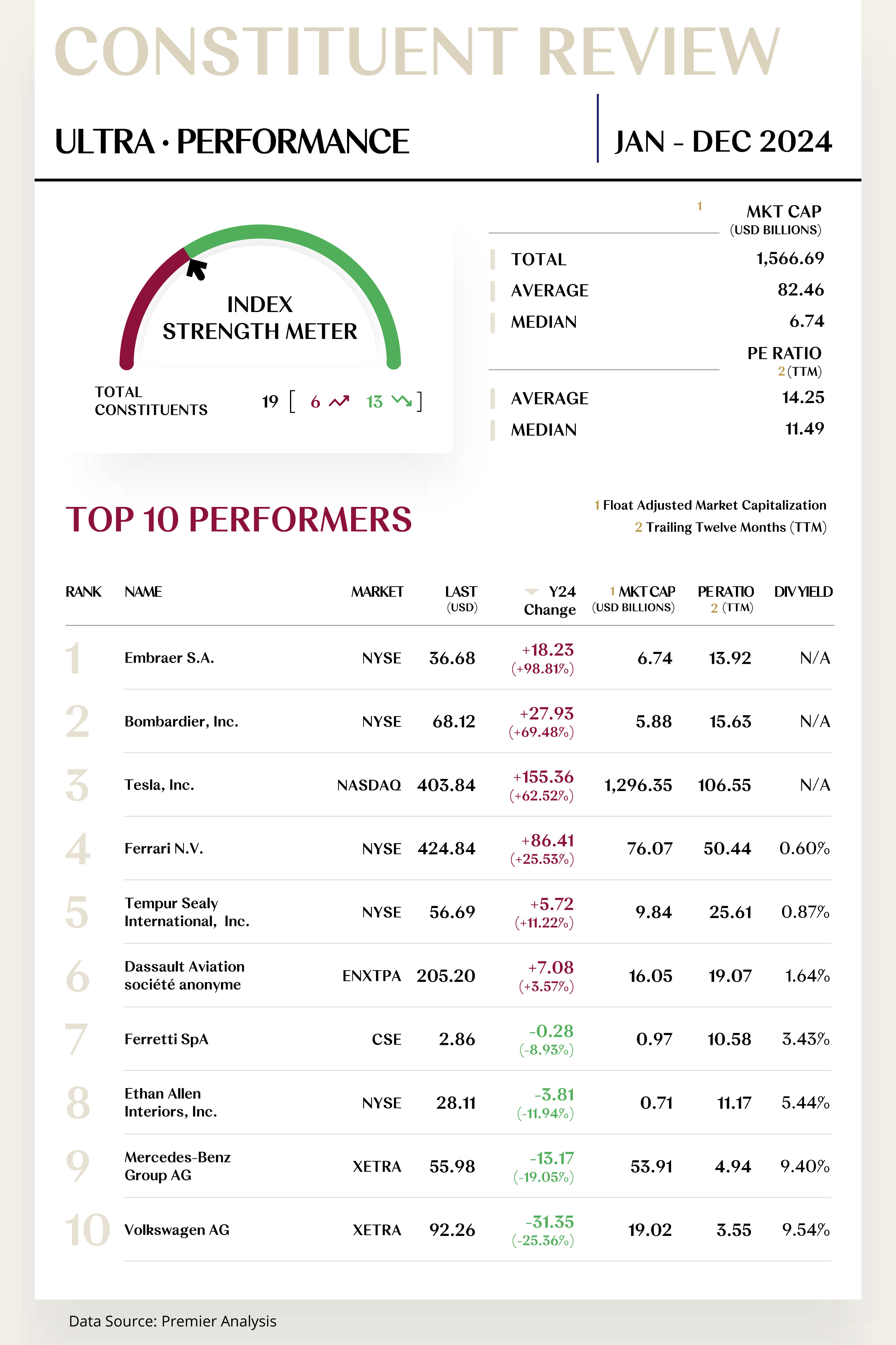 The Ultra Luxe Index comprises 19 stocks, with 6 rising and 13 falling.