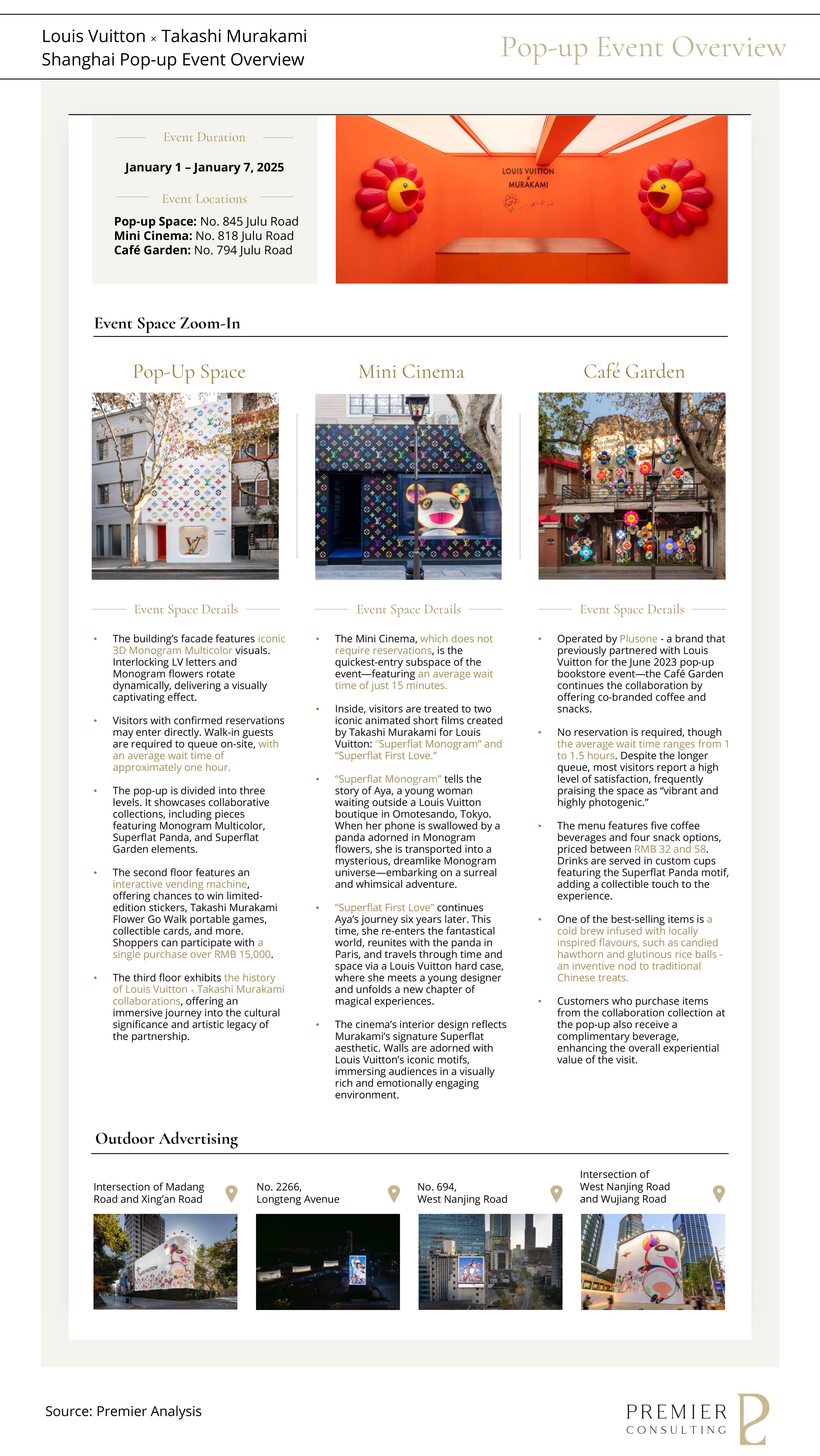 Limited-time retail activations have become a standard tactic in brand marketing. With substantial budgets, top-tier brands now routinely execute “City Takeovers”—a marketing strategy that saturates urban spaces with immersive brand presence. Yet the Louis Vuitton × Takashi Murakami collaboration raises the bar once again. Beyond the immersive retail environment, the brand has introduced a Mini Cinema and a curated Café Garden, evolving the pop-up model into a multifunctional experience hub—and setting a new benchmark for the industry.