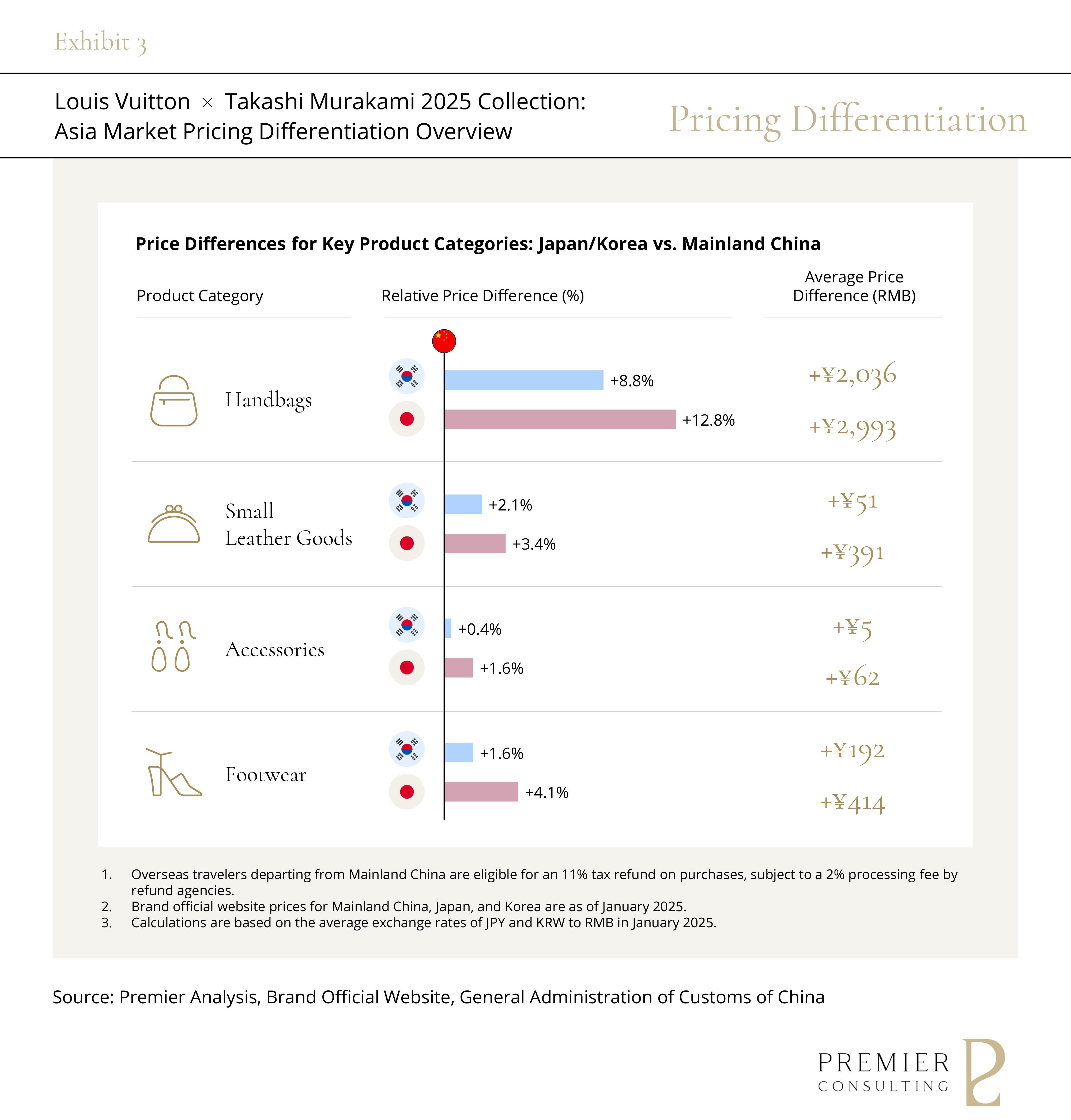 In the context of the Asian luxury landscape, pricing for the Murakami collaboration is noticeably more favourable in China. For example, within the handbag category, Korean consumers enjoy an average tax-free price advantage of 8.8% when purchasing in China compared to their home market. Japanese customers benefit even more, with a 12.8% average price difference [Exhibit 4]. Additionally, limited product availability on Louis Vuitton’s official Korean website has further pushed consumers toward cross-border shopping in more product-rich and price-competitive markets.