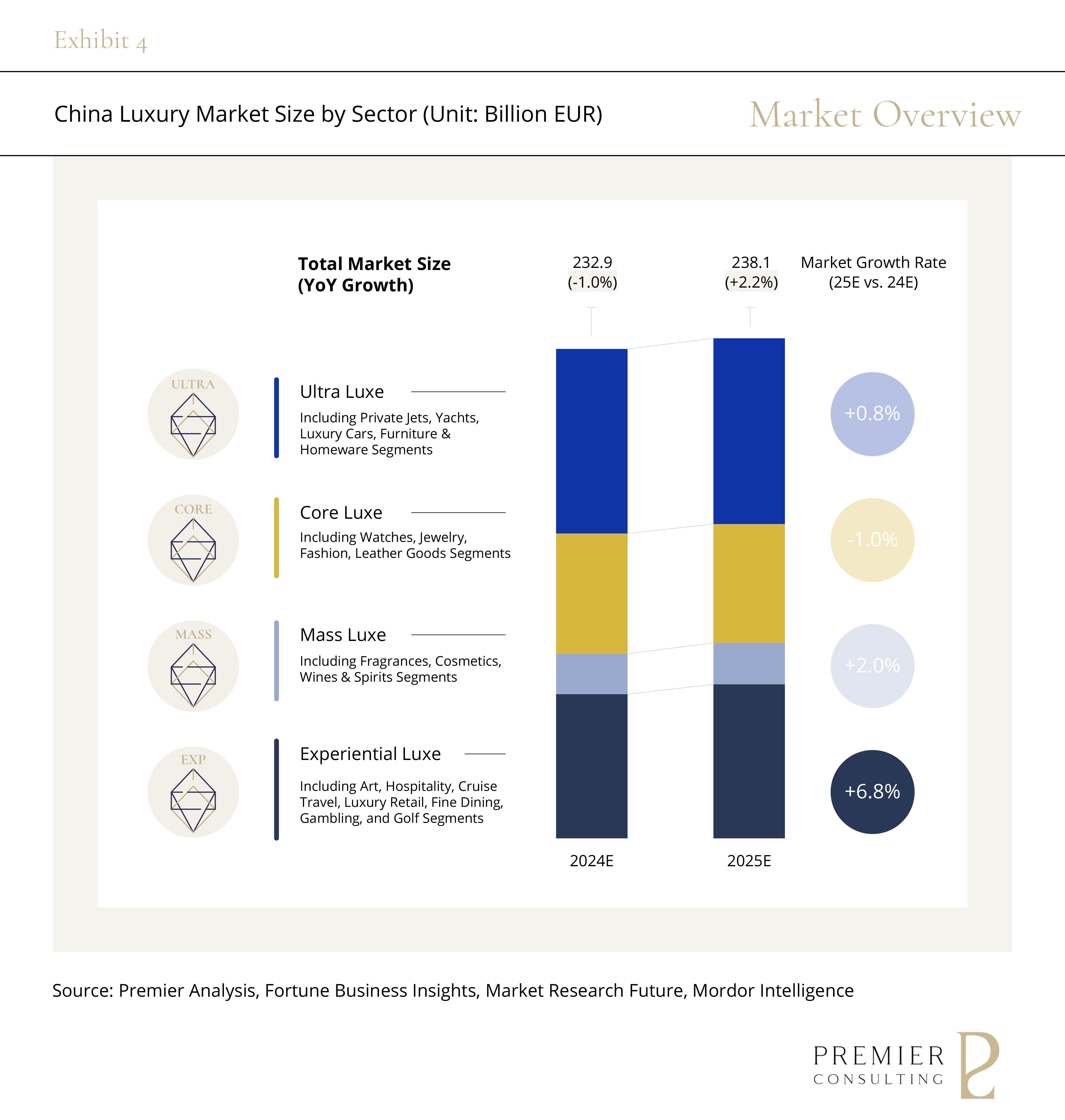 Luxury is increasingly permeating the full lifestyle ecosystem. High-end hotels, fine dining, luxury cruises, wellness retreats, sports events, and exclusive cultural experiences—once the domain of premium lifestyle categories—are now strategic priorities for global luxury groups. Premier forecasts that by 2025, China’s experiential luxury market will grow at a compound annual rate of 6.8% [Exhibit 4], far outpacing the growth of traditional luxury segments and contributing significantly to the broader market rebound.