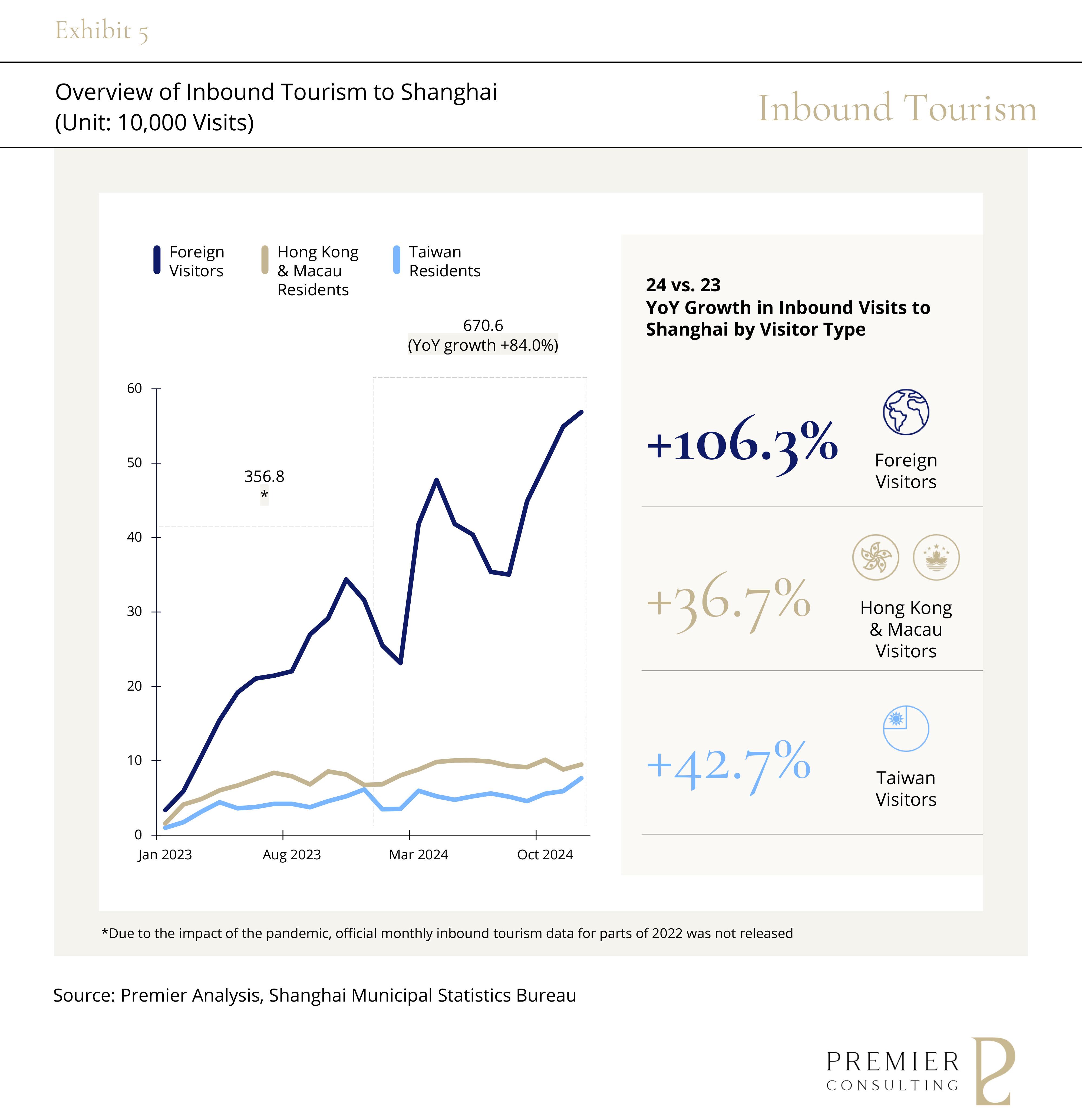 The impact of relaxed travel policies has been quickly reflected in data. In 2024, international arrivals into Shanghai reached 6.706 million, representing an 84% year-on-year increase [Exhibit 5]. Among them, the growth in foreign tourists was particularly striking—surging by 106.3%. This upward trend extended beyond visitors from Europe, North America, and Southeast Asia—travellers from Hong Kong, Macau, and Taiwan also showed a strong rebound.