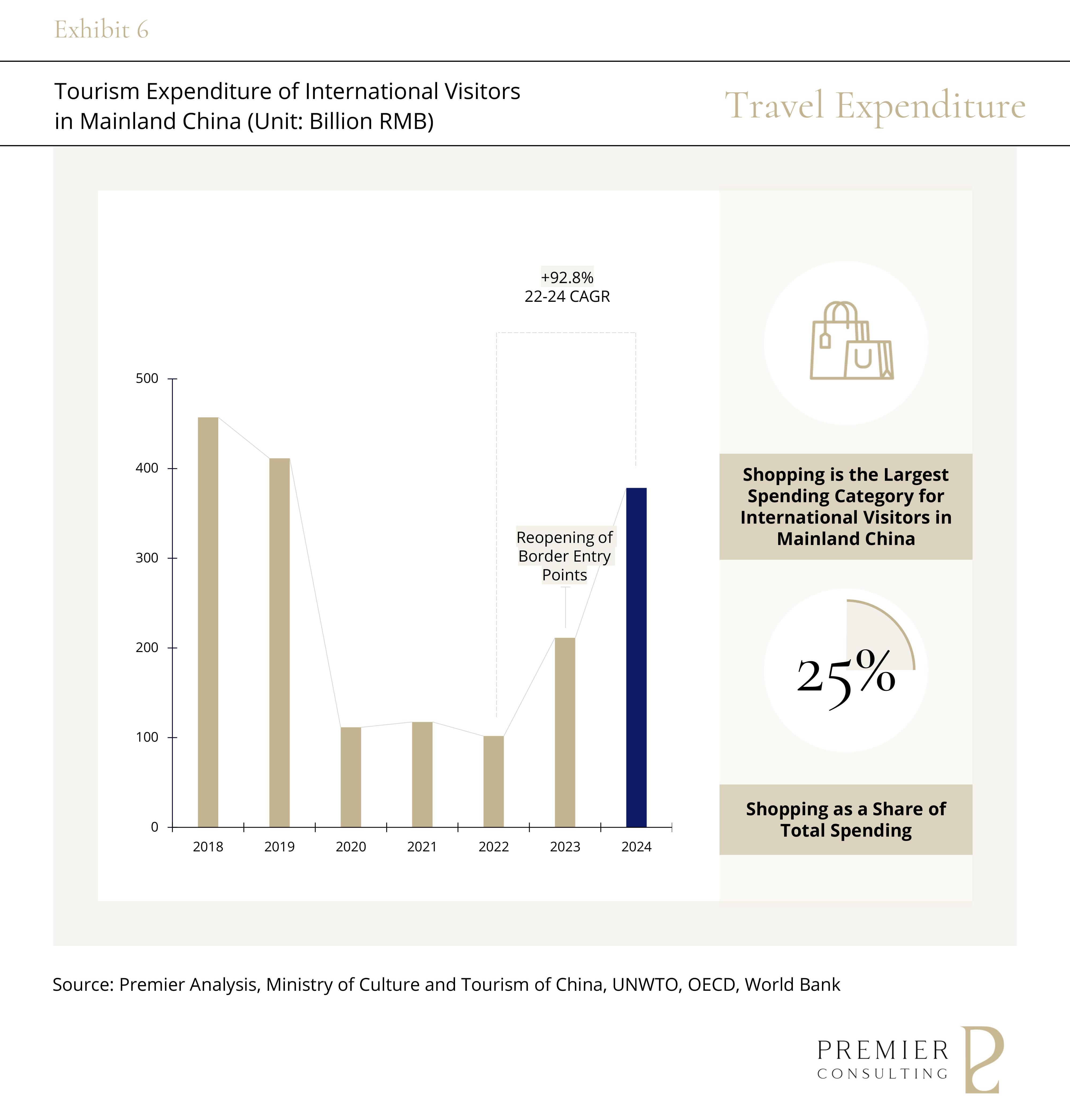 The spending power of international tourists in China is also remarkable. In 2024, international tourist expenditure in Mainland China grew at a compound annual rate of 92.8%, with shopping accounting for 25% [Exhibit 6] —the largest share of visitor spending. In other words, travel to China is no longer only about sightseeing and cultural exploration—it has also become a critical opportunity for global luxury brands to recapture outbound spending within Chinese borders.