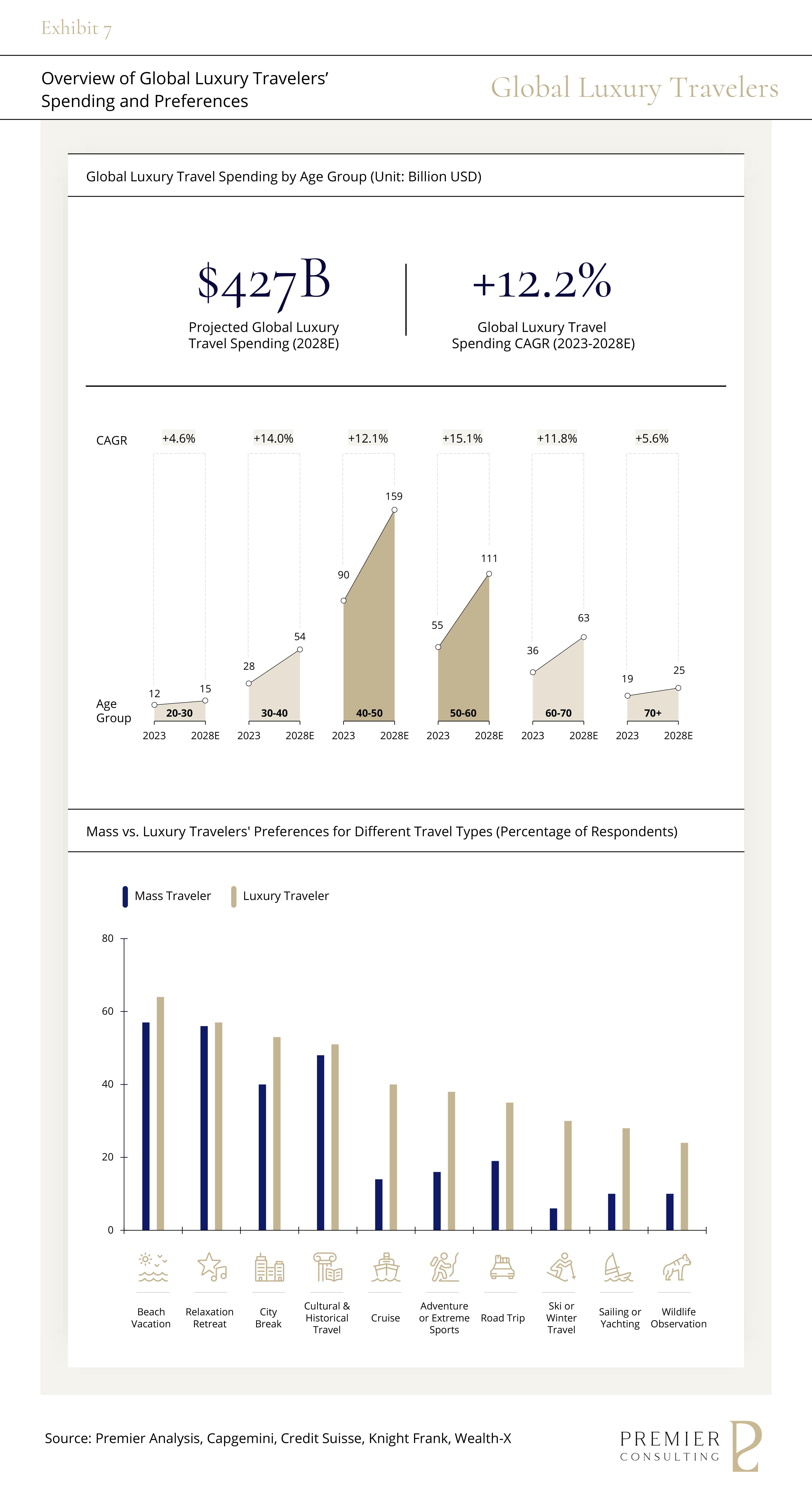 - A Younger Spending Core: While Baby Boomers (born 1946–1964) still wield purchasing power, 60% of the luxury leisure travel market is now driven by consumers under 60 [Exhibit 7]. In particular, the 40–60 age segment is showing high levels of travel activity. The younger generation’s growing demand for high-end travel is driving luxury brands to rethink and innovate their product and service offerings, with a strong emphasis on meaningful, experience-driven design.