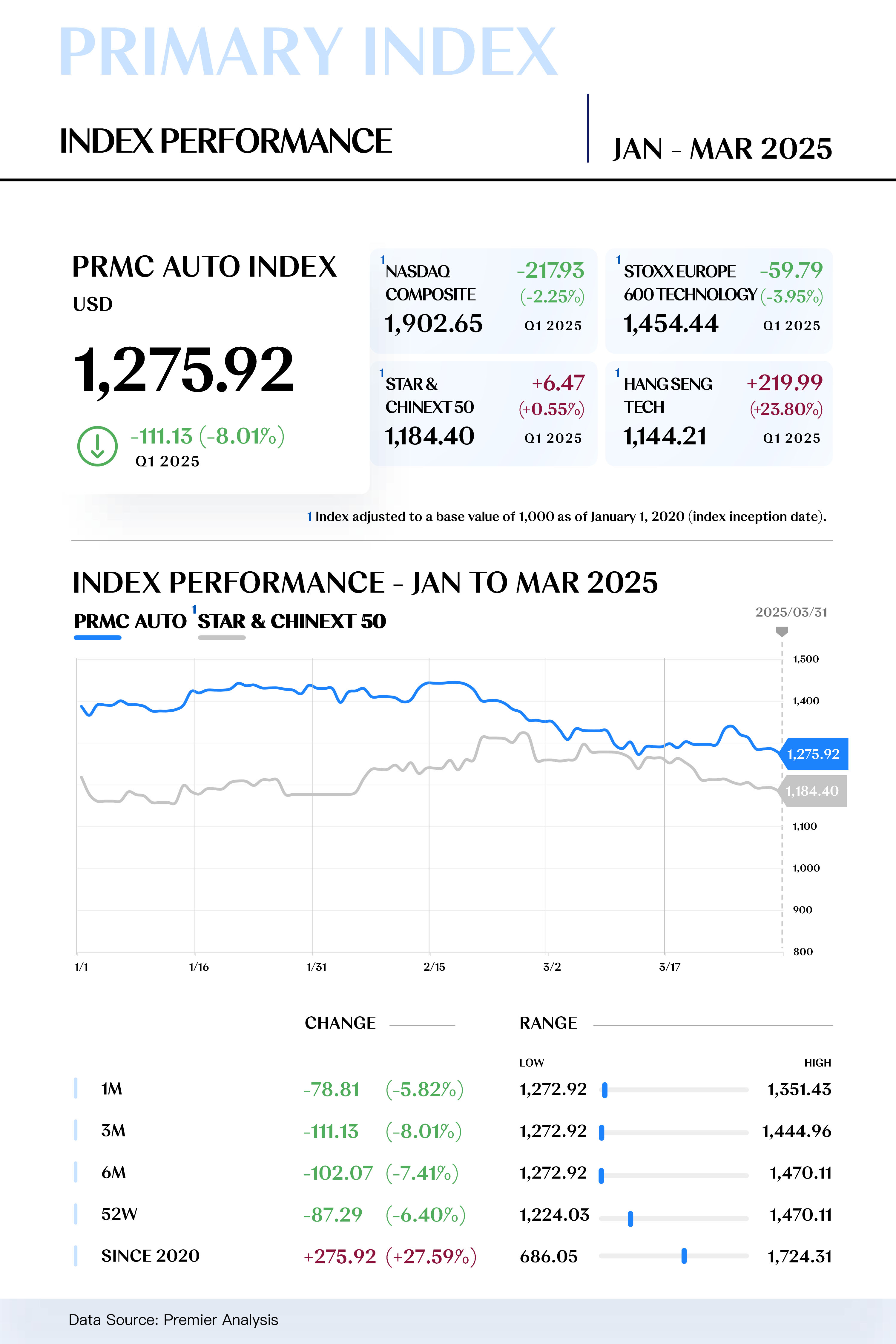 The PRMC Auto Index closed at 1,275.73 points in Q1, declining by 111.13 points (-8.01%), underperforming key global indices such as the NASDAQ Composite, STAR & CHINEXT 50, STOXX Europe 600 Technology, and Hang Seng Tech. Among the secondary indices, the Auto Manufacturing Index recorded the largest drop (-13.43%), followed by the Auto Supply Index (-5.65%), while the Auto Service Index proved more resilient (-3.13%).