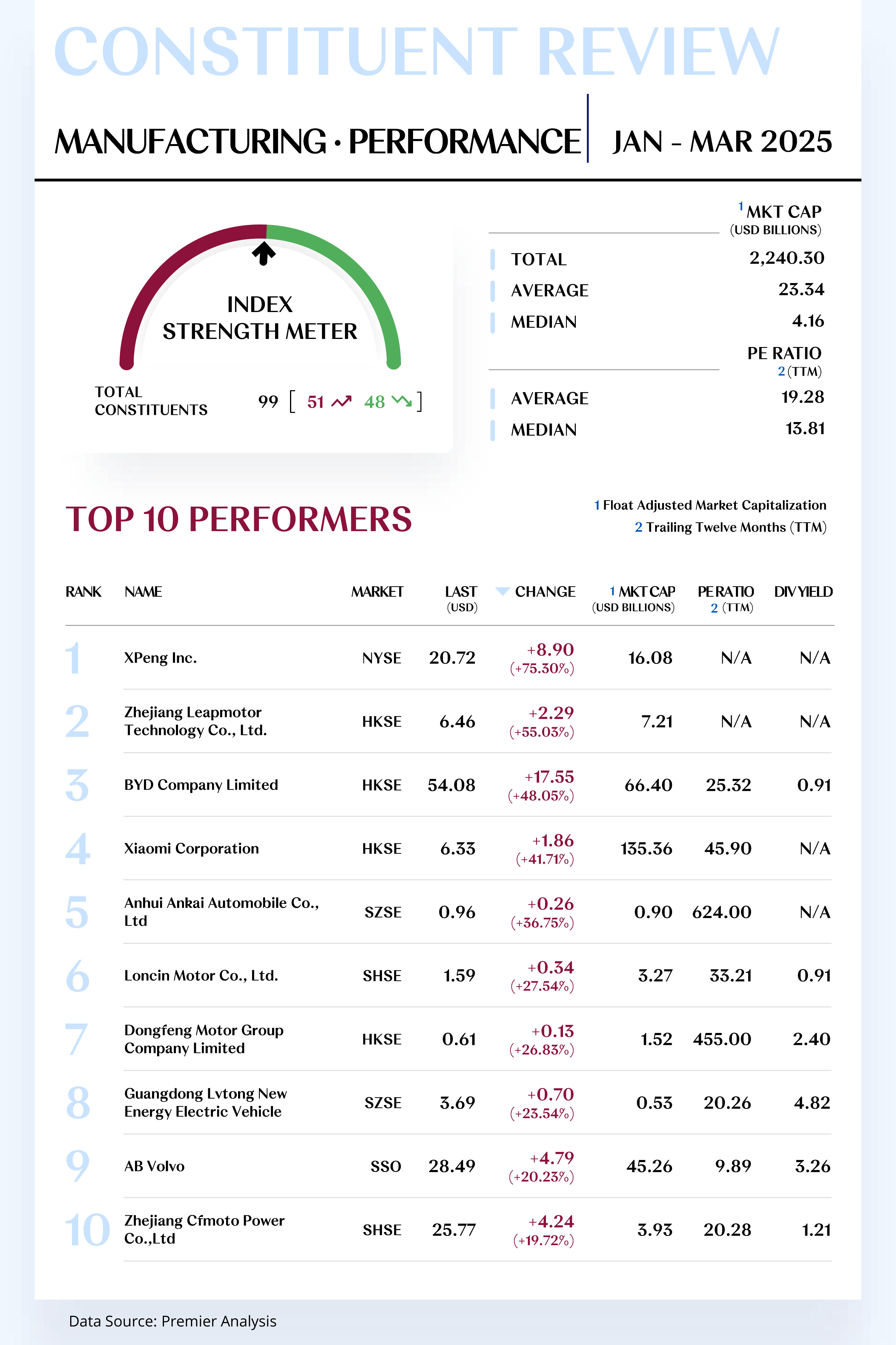 In the first quarter of 2025, the PRMC Auto Index closed at 1,275.92 points, declining by 111.13 points, a decrease of 8.01%. Frequent shifts in global macroeconomic policies and geopolitical tensions significantly impacted investment sentiment and valuations across the automotive sector. In late March, U.S. President Trump signed an executive order imposing a uniform 25% tariff on all imported vehicles, exceeding market expectations and placing substantial cost pressures on foreign automakers, while further intensifying global trade frictions. Simultaneously, the U.S. tightened export controls on China’s high-tech sectors, affecting the cross-border flow of smart vehicle chips and autonomous driving technologies, thereby undermining confidence in the industry’s innovation chain. Under these combined headwinds, the sector remained under pressure, with valuation premiums continuing to compress.