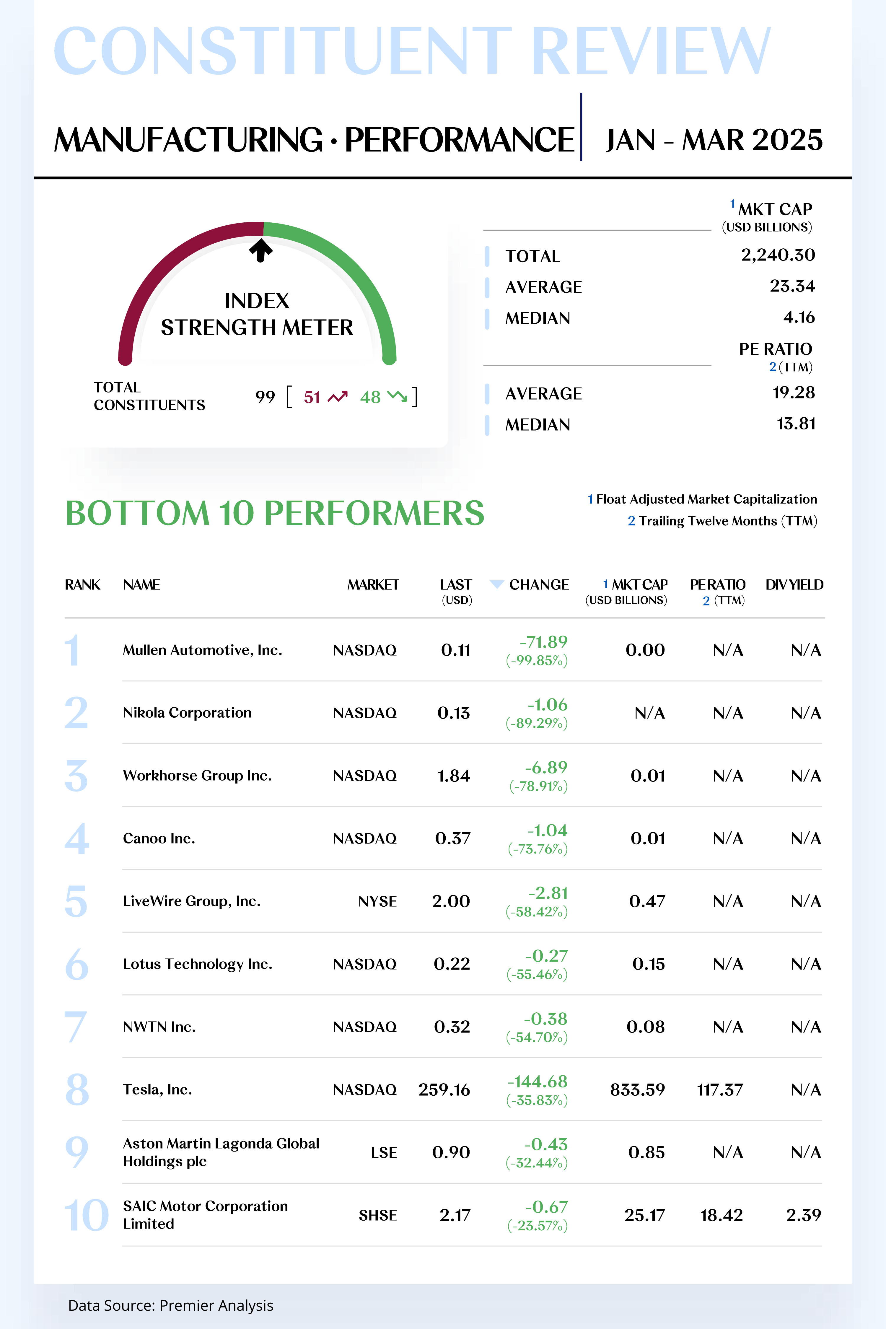 The Auto Manufacturing Index comprises 99 stocks, with 42 rising and 57 declining.